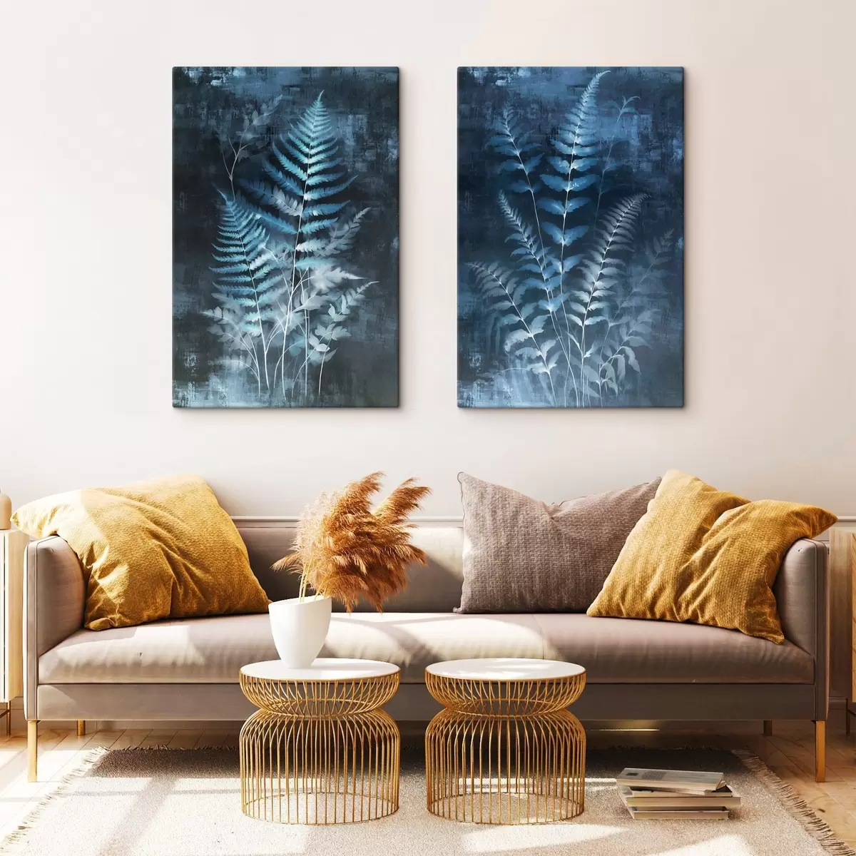 Obraz Niebieskie paprocie i rośliny na ciemnym, teksturowanym tle, z naciskiem na skomplikowane detale, efekt rentgenowski. Nr m01121