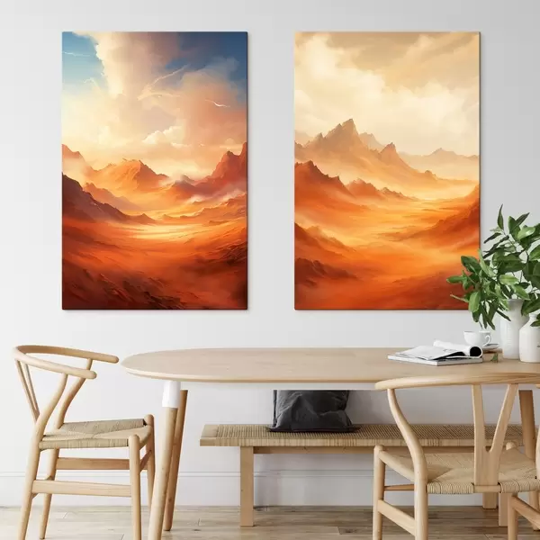 Obraz Rozległy, pomarańczowy krajobraz pustynny z wysokimi, skalistymi górami pod zamglonym, nasłonecznionym niebem z rzadkimi chmurami. Nr m01122