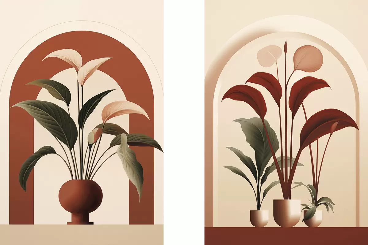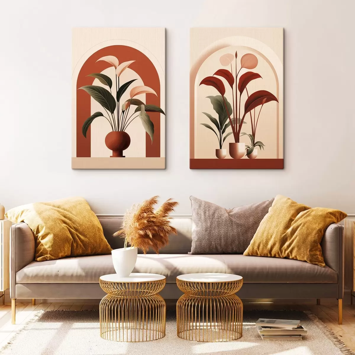Obraz Abstrakcyjne rośliny doniczkowe z dużymi zielonymi i czerwonymi liśćmi przed kremową bramą łukową. Nr m01124