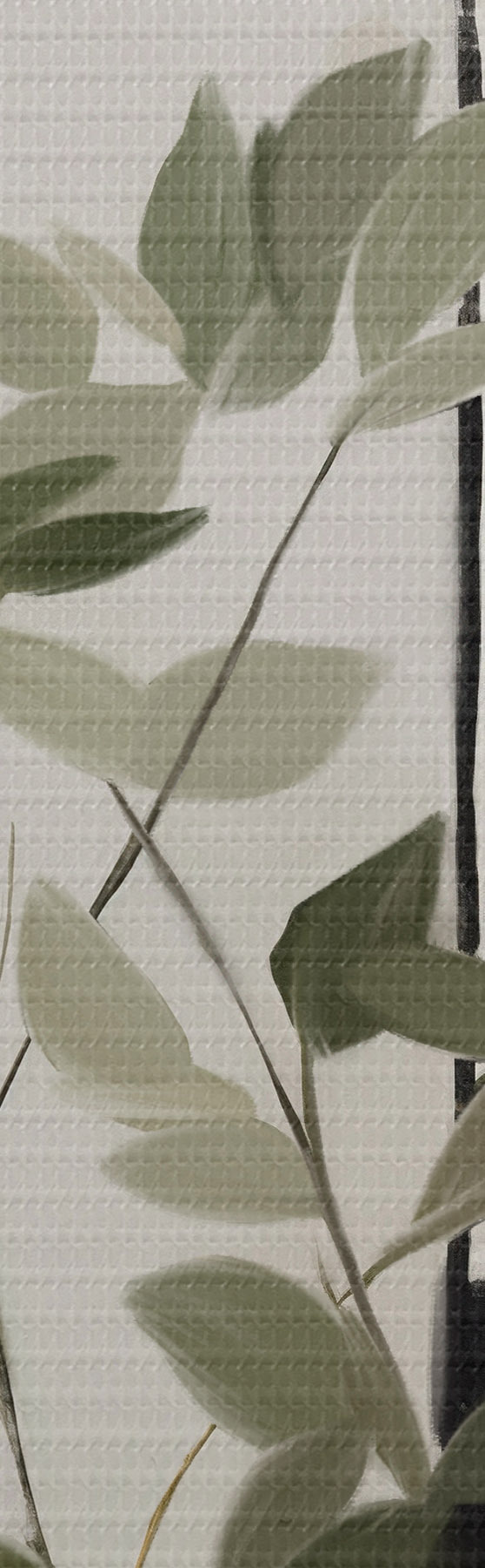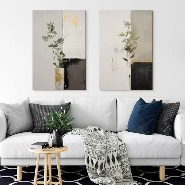 Obraz Minimalistyczny obraz przedstawiający wazon z zielonymi liśćmi na tle abstrakcyjnych geometrycznych kształtów. Nr m01126