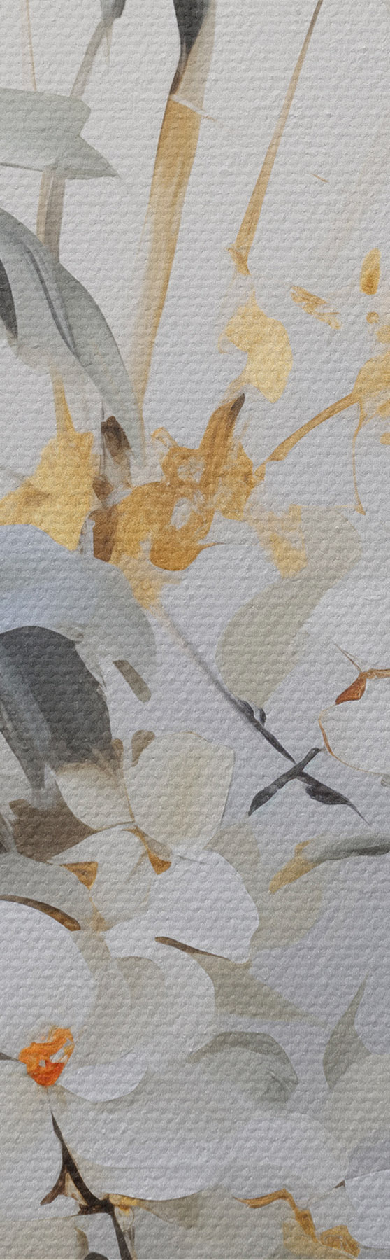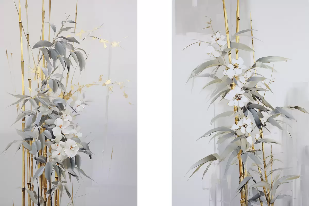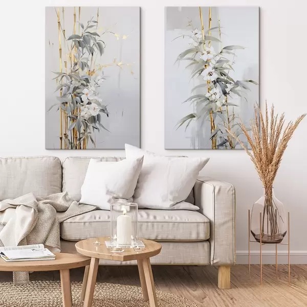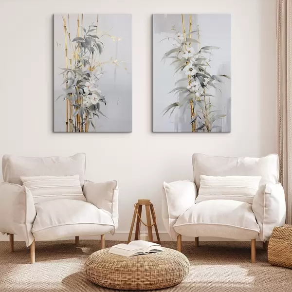 Obraz Abstrakcyjne łodygi bambusa z żółtymi akcentami, delikatnymi białymi kwiatami i jasnozielonymi liśćmi, szare tło Nr m01127