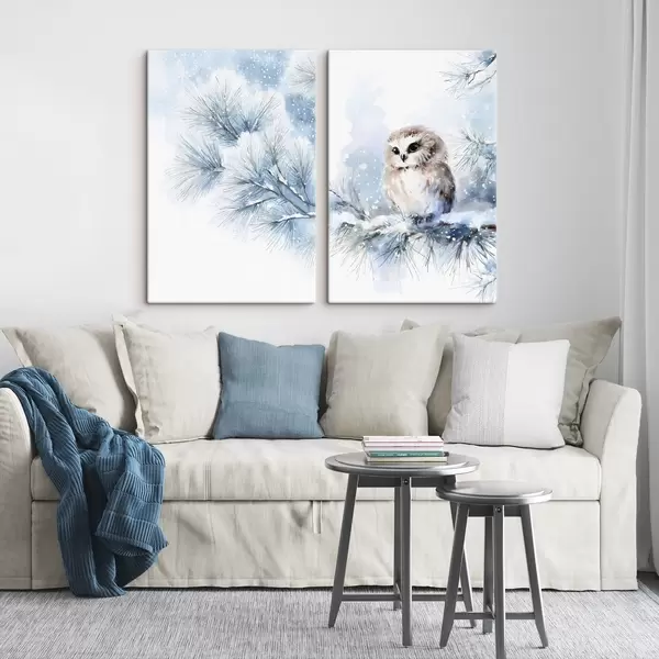 Obraz urocza sowa na pokrytej śniegiem gałęzi sosny w stylu akwareli Nr m01168