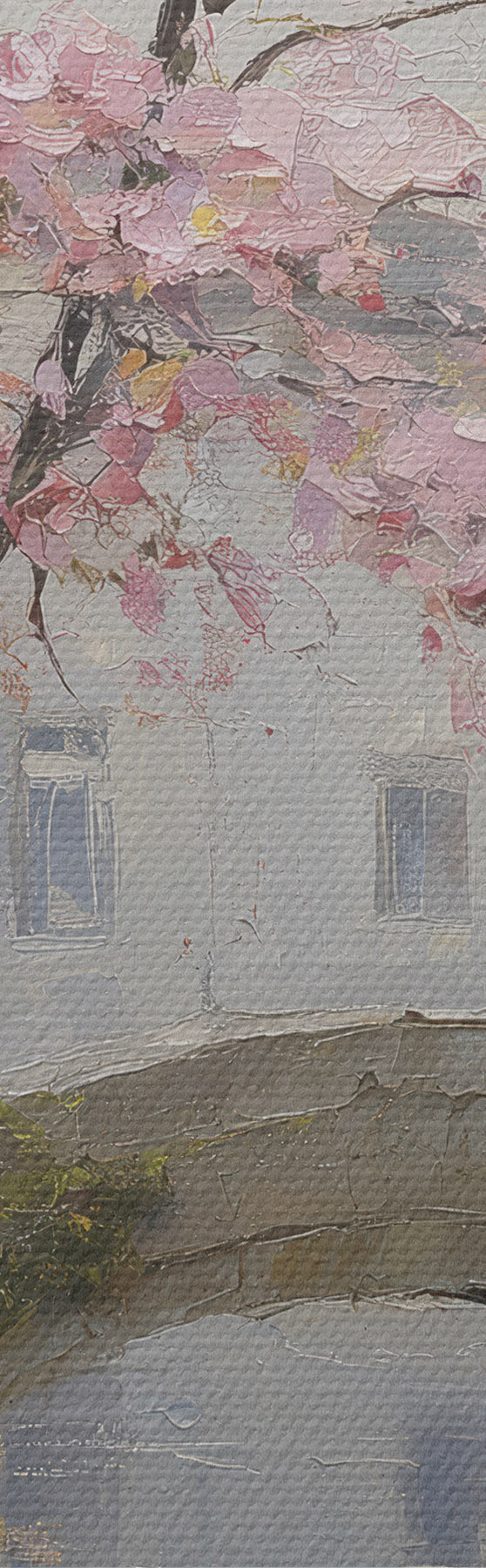 Obraz romantyczny pejzaż miejski z kwitnącym drzewem w stylu malarstwa olejnego Nr m01173