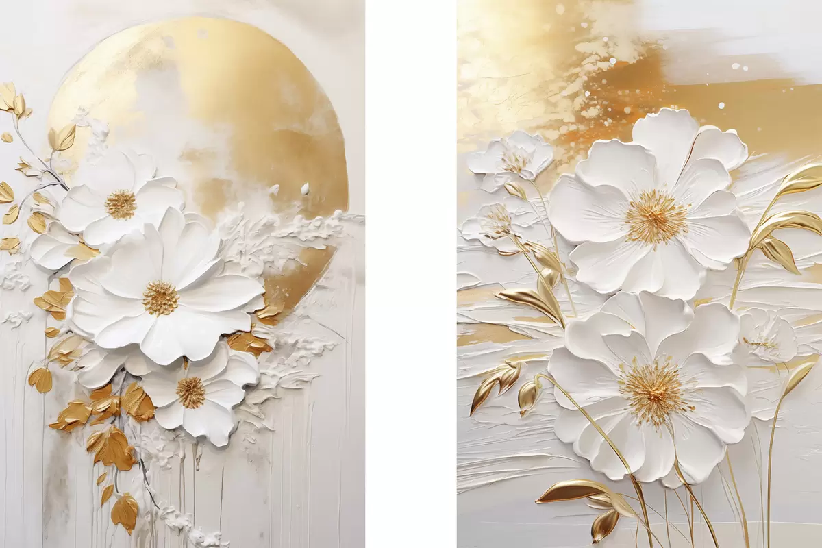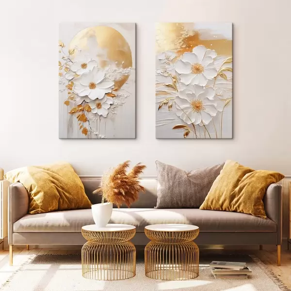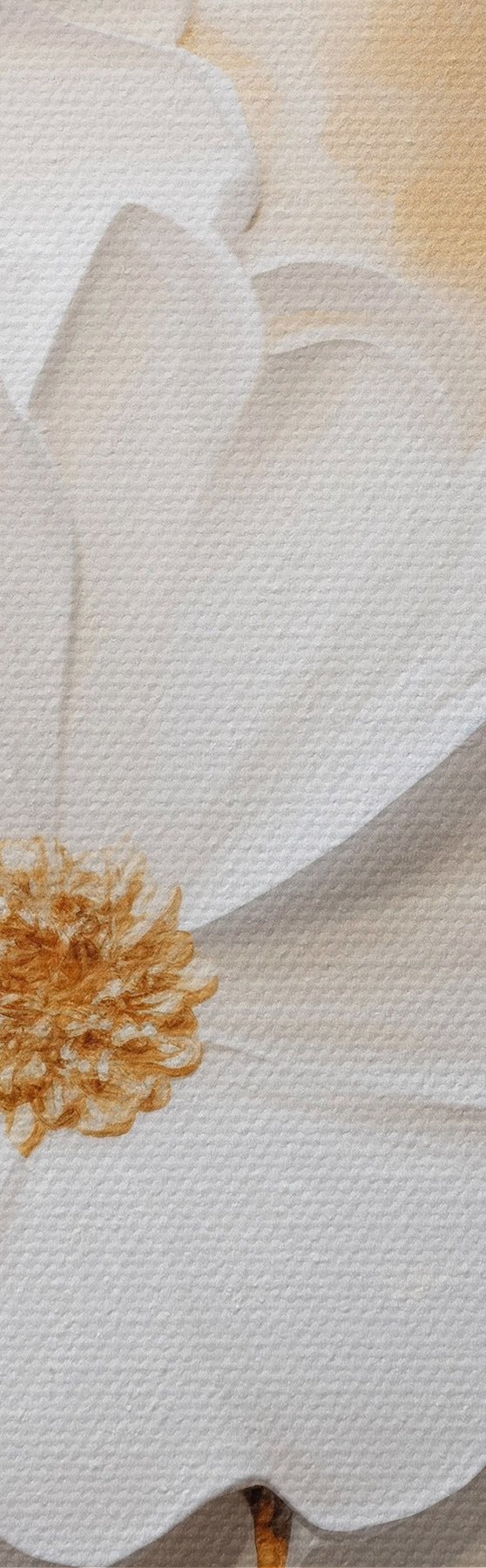 Obraz Białe kwiaty z żółtymi akcentami i delikatnymi liśćmi na teksturowanym tle, sztuka współczesna Nr m01233