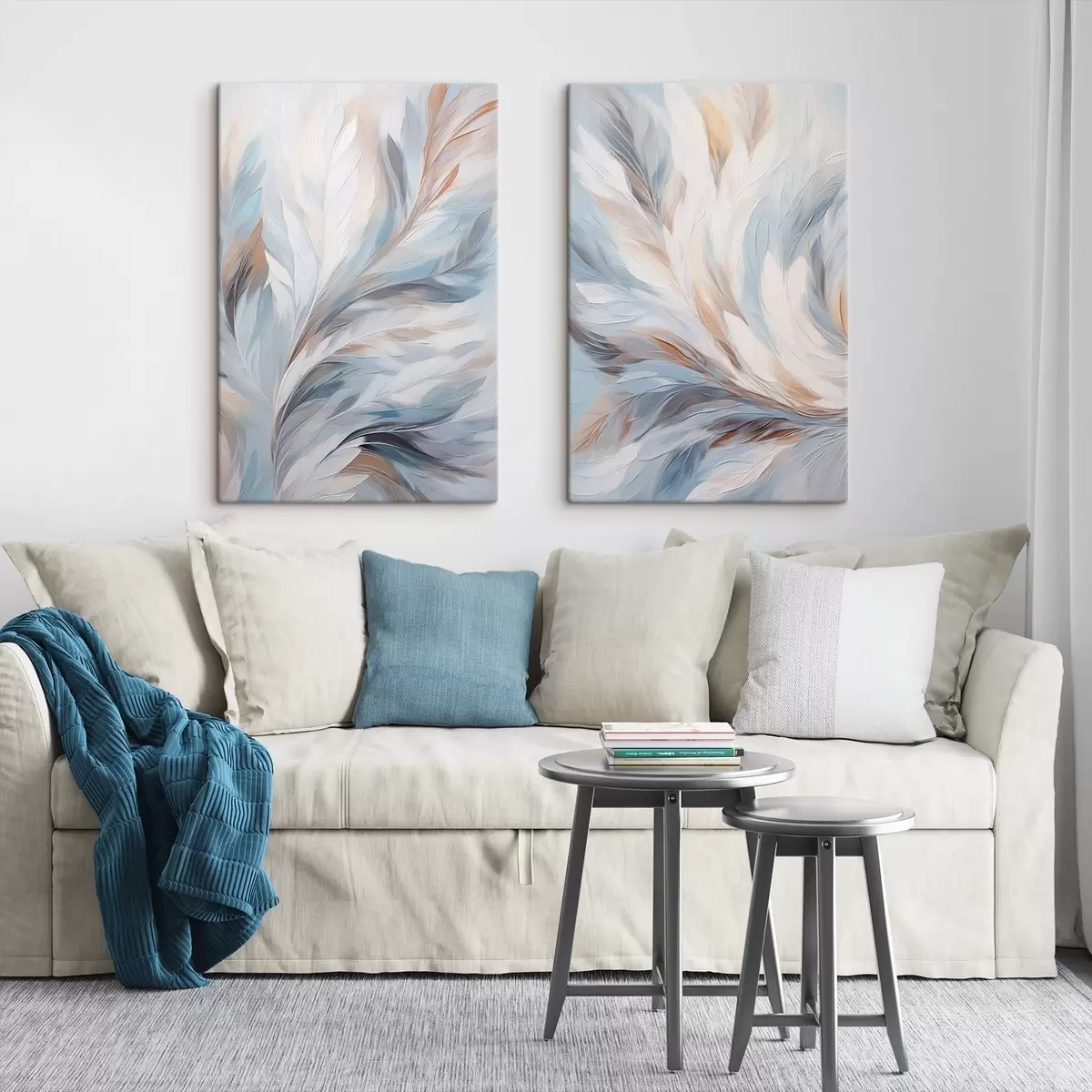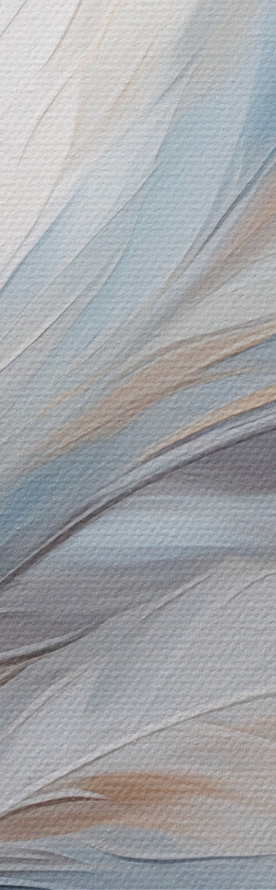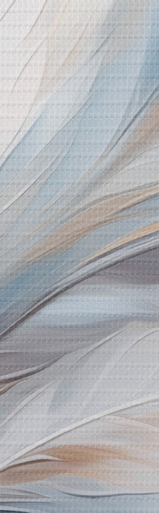Obraz Abstrakcyjny obraz przedstawiający pióra w odcieniach bieli, błękitu i brązu, o miękkiej, płynnej fakturze i jasnym tle. Nr m01234