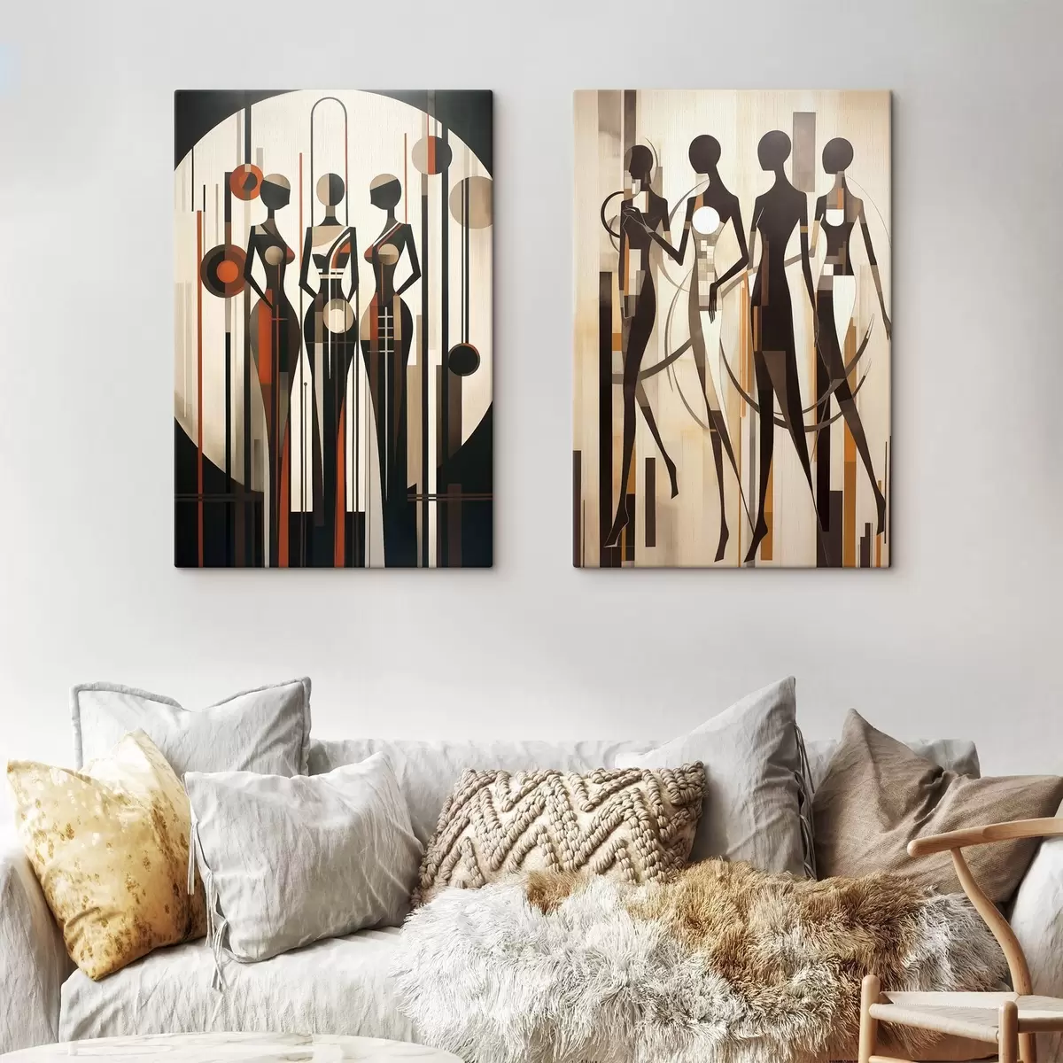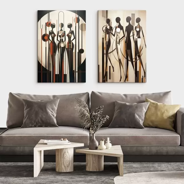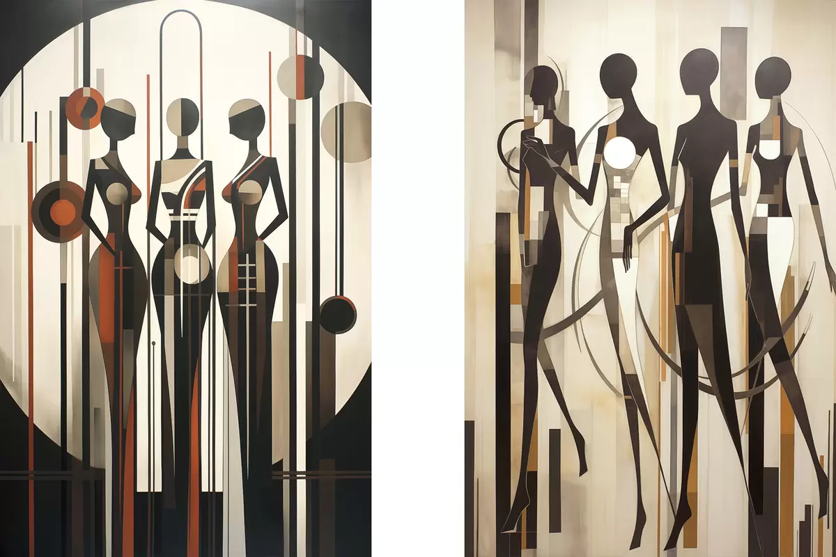 Obraz Stylizowane postacie kobiece z elementami geometrycznymi na abstrakcyjnym tle pionowych linii i okręgów Nr m01237