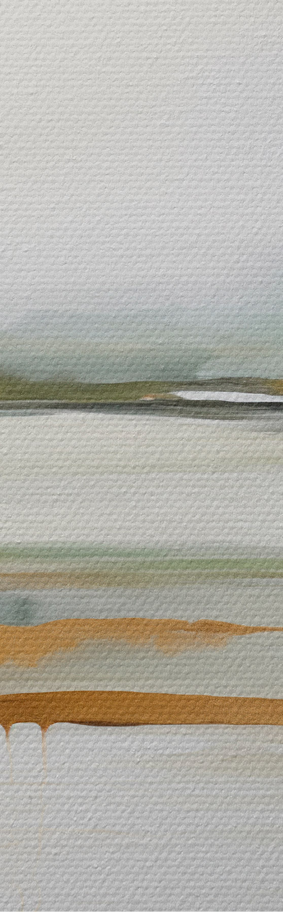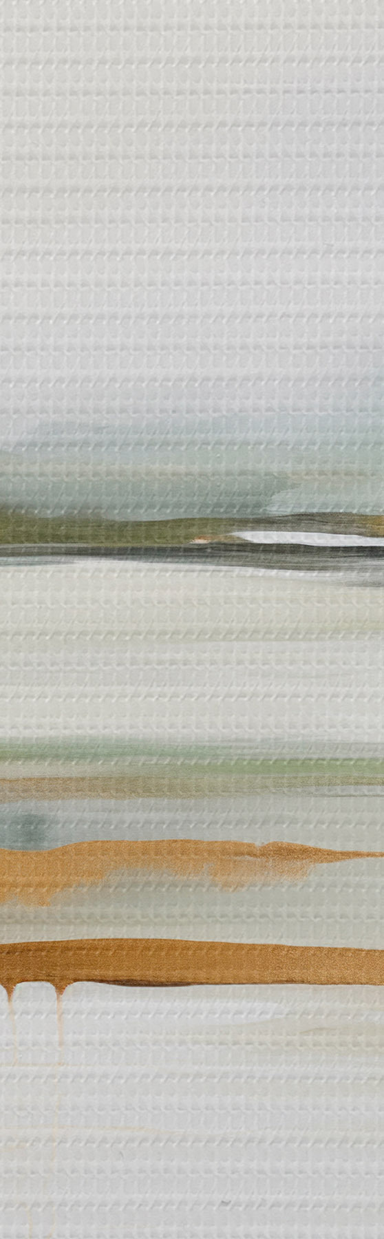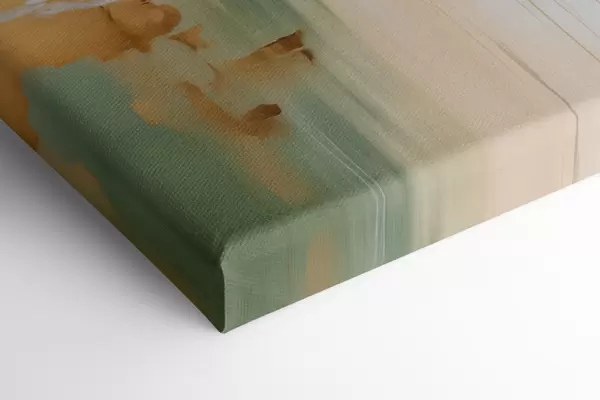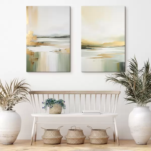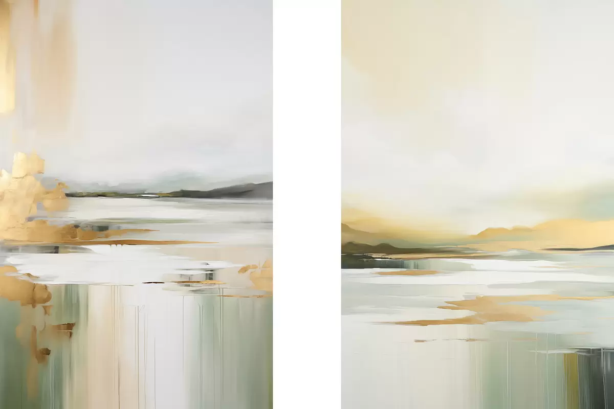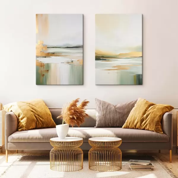 Obraz Abstrakcyjny krajobraz w odcieniach żółci i zieleni, woda odbijająca niebo i odległe góry, blade, zamglone niebo. Nr m01245
