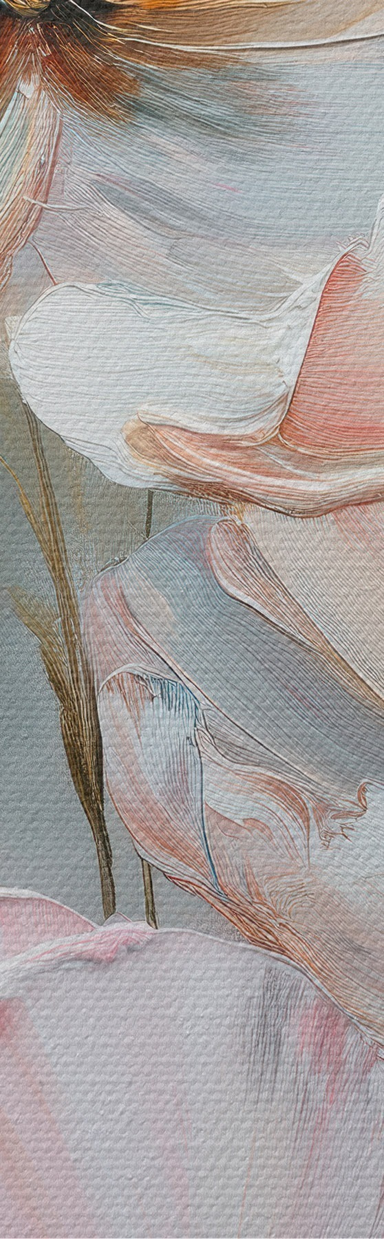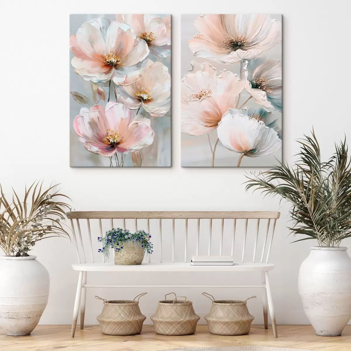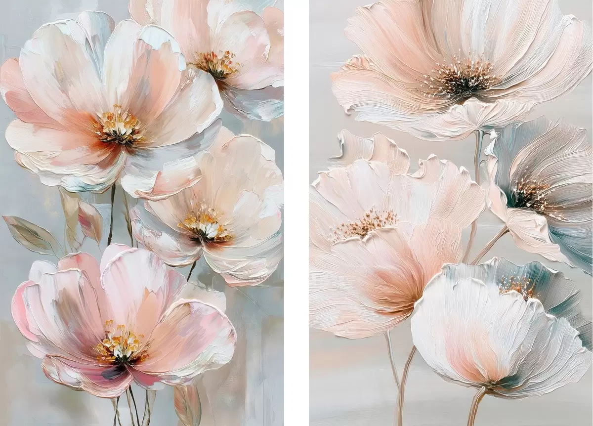 Obraz Dwuczęściowy obraz kwiatowy w beżowo-koralowej palecie barw, wykonany w stylu malarstwa olejnego. Nr m30029