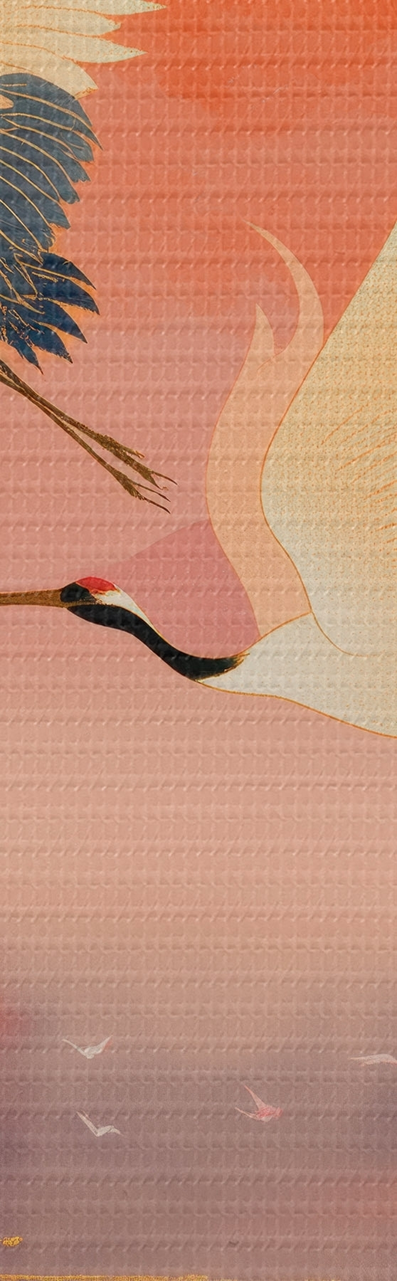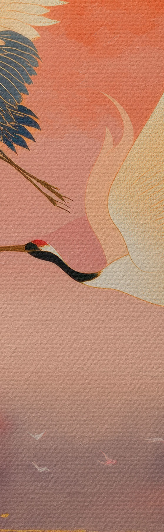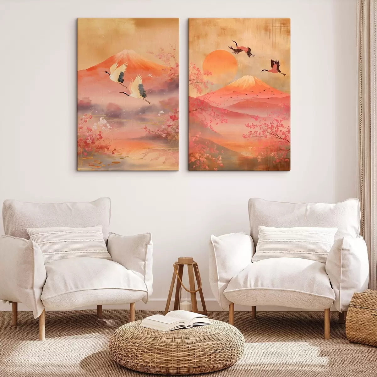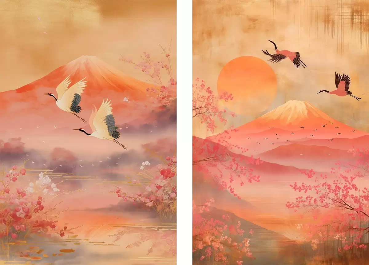 Obraz Japoński krajobraz z żurawiami i górą Fuji w klasycznym stylu ilustracyjnym Nr m30042