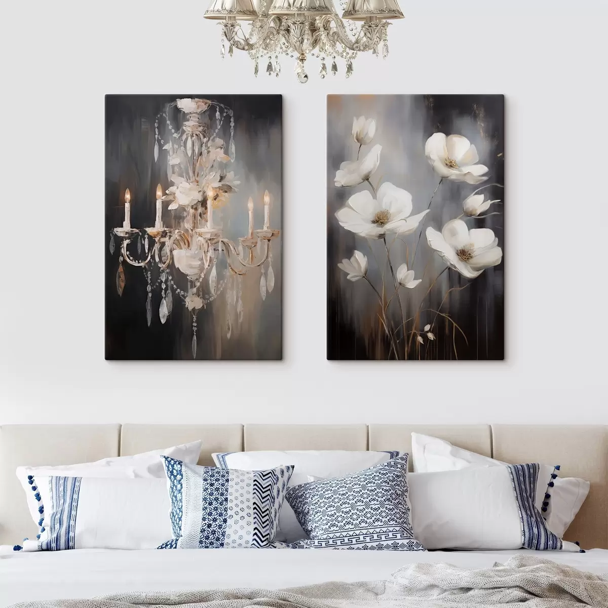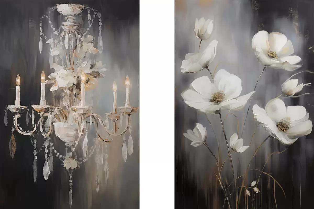 Obraz Abstrakcyjny, ozdobny żyrandol z zapalonymi świecami i motywami kwiatowymi na ciemnym, teksturowanym tle. Nr m30049