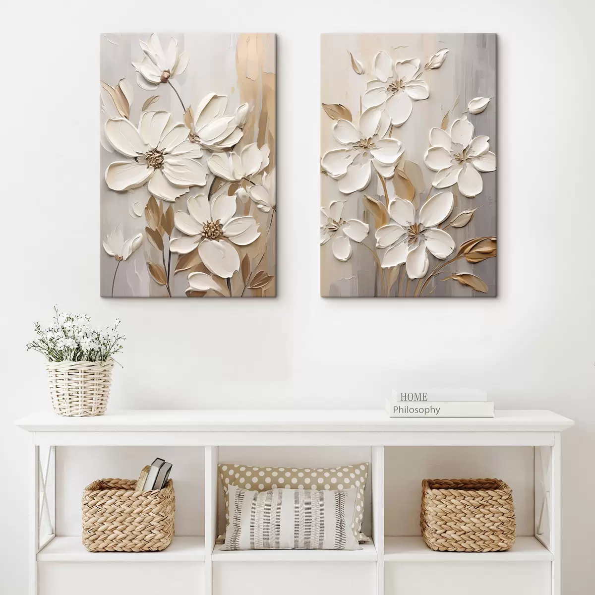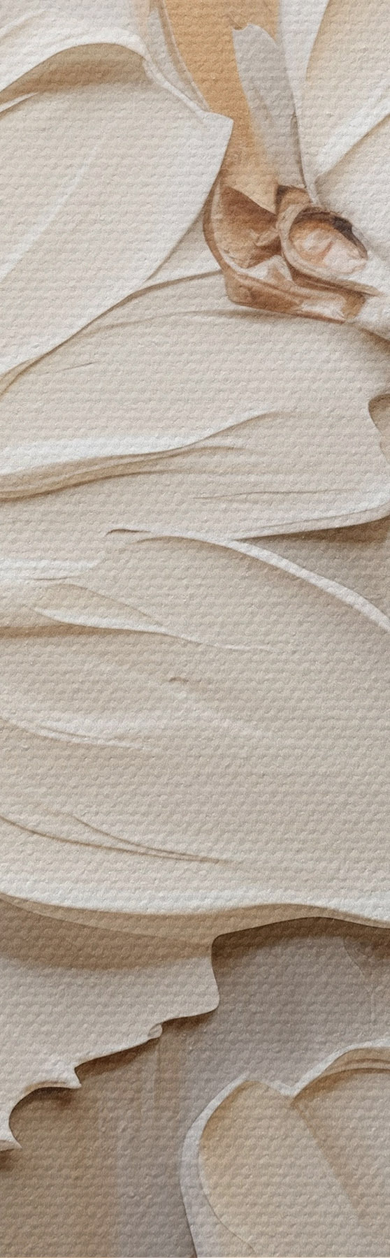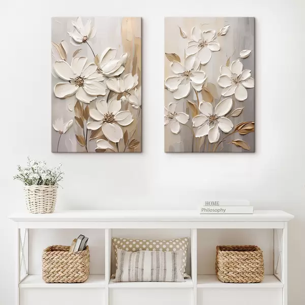 Obraz Abstrakcyjne białe kwiaty z teksturowanymi płatkami na neutralnym tle z subtelnymi pociągnięciami pędzla imitującymi Nr m30057