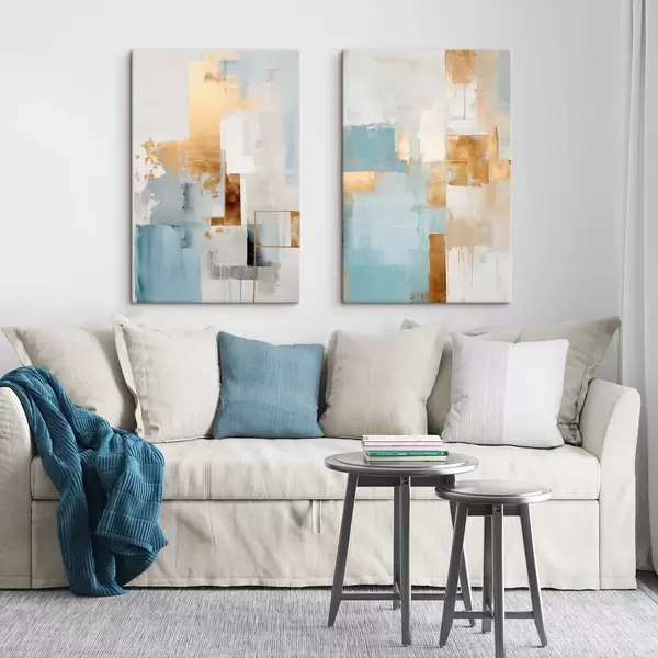 Obraz Abstrakcyjne geometryczne kształty w kolorach żółtym, niebieskim i białym, teksturowana i minimalistyczna kompozycja Nr m30061