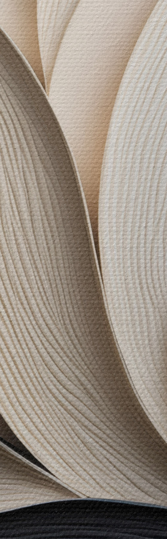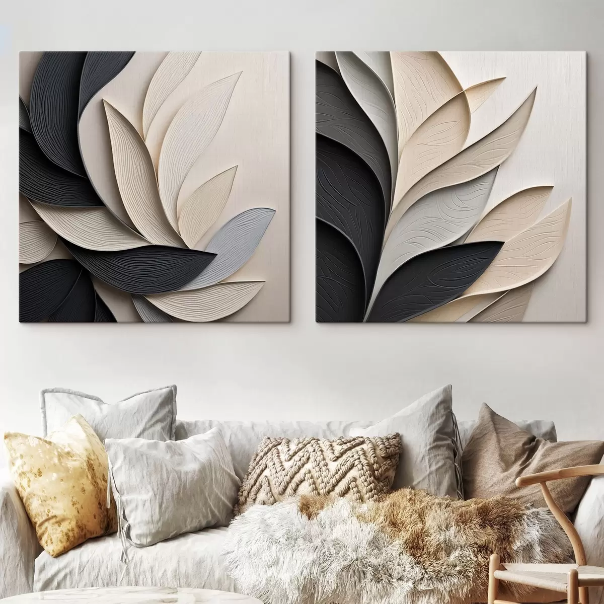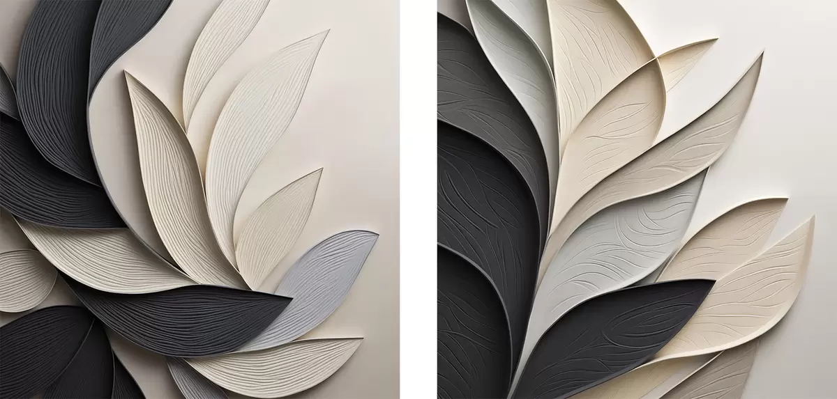 Obraz Kompozycja abstrakcyjna złożona z ułożonych warstwowo liści, zakrzywionych kształtów w kolorach czarnym, białym i beżowym oraz teksturowanych elementów Nr m30195