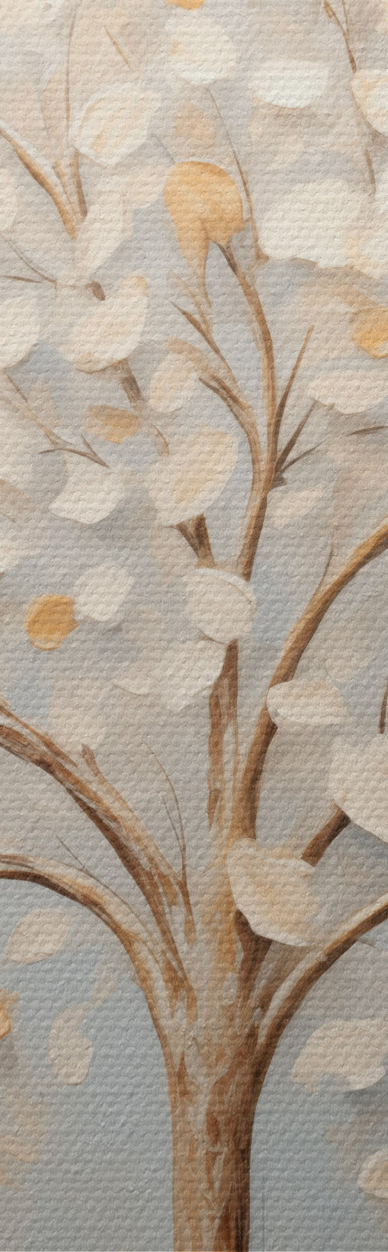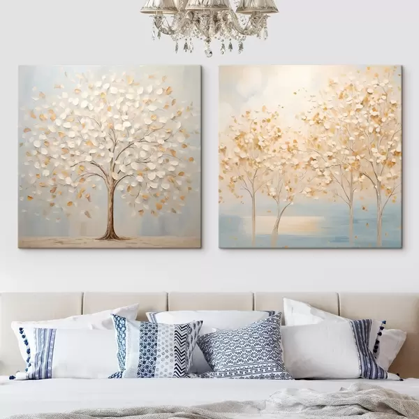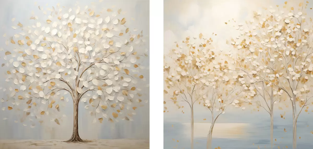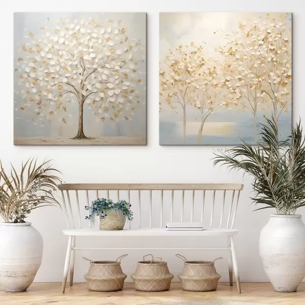 Obraz Obraz przedstawiający drzewa o fakturalnym wyglądzie, z białymi i żółtymi liśćmi na jasnoniebieskim tle Nr m30200