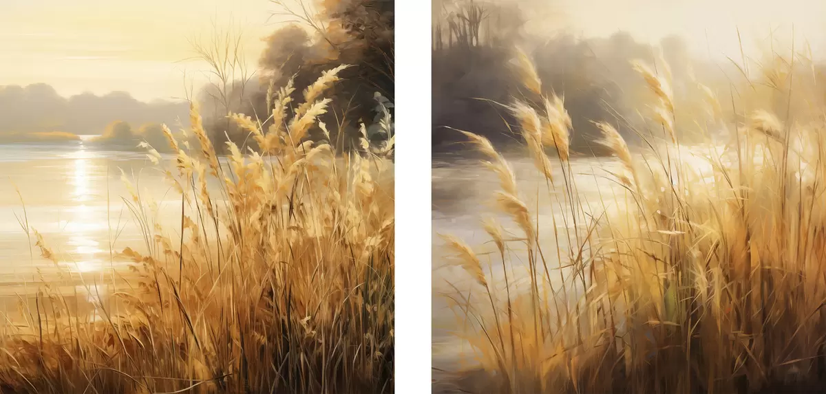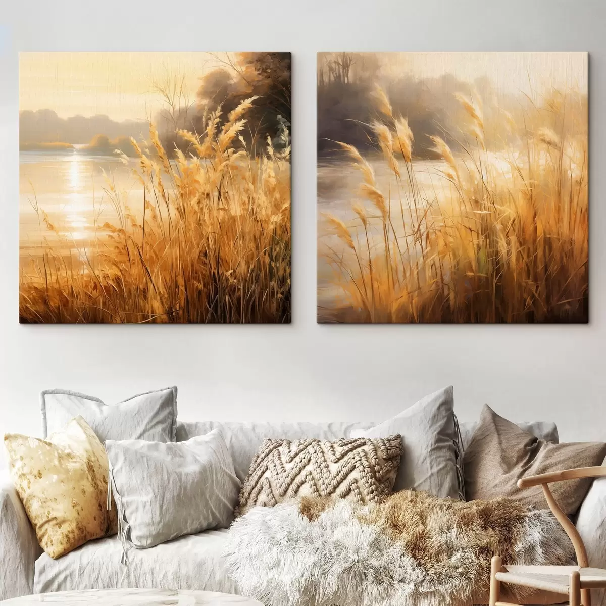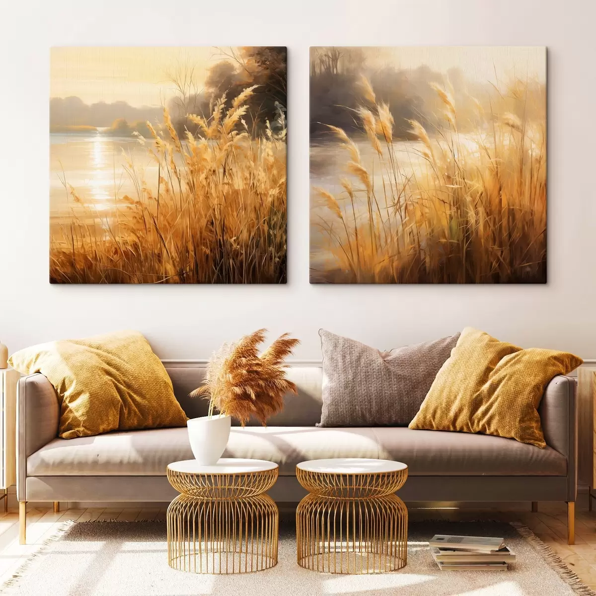 Obraz Na pierwszym planie wysoka, wyschnięta trawa z kłoskami, a w tle jezioro i drzewa Nr m30201