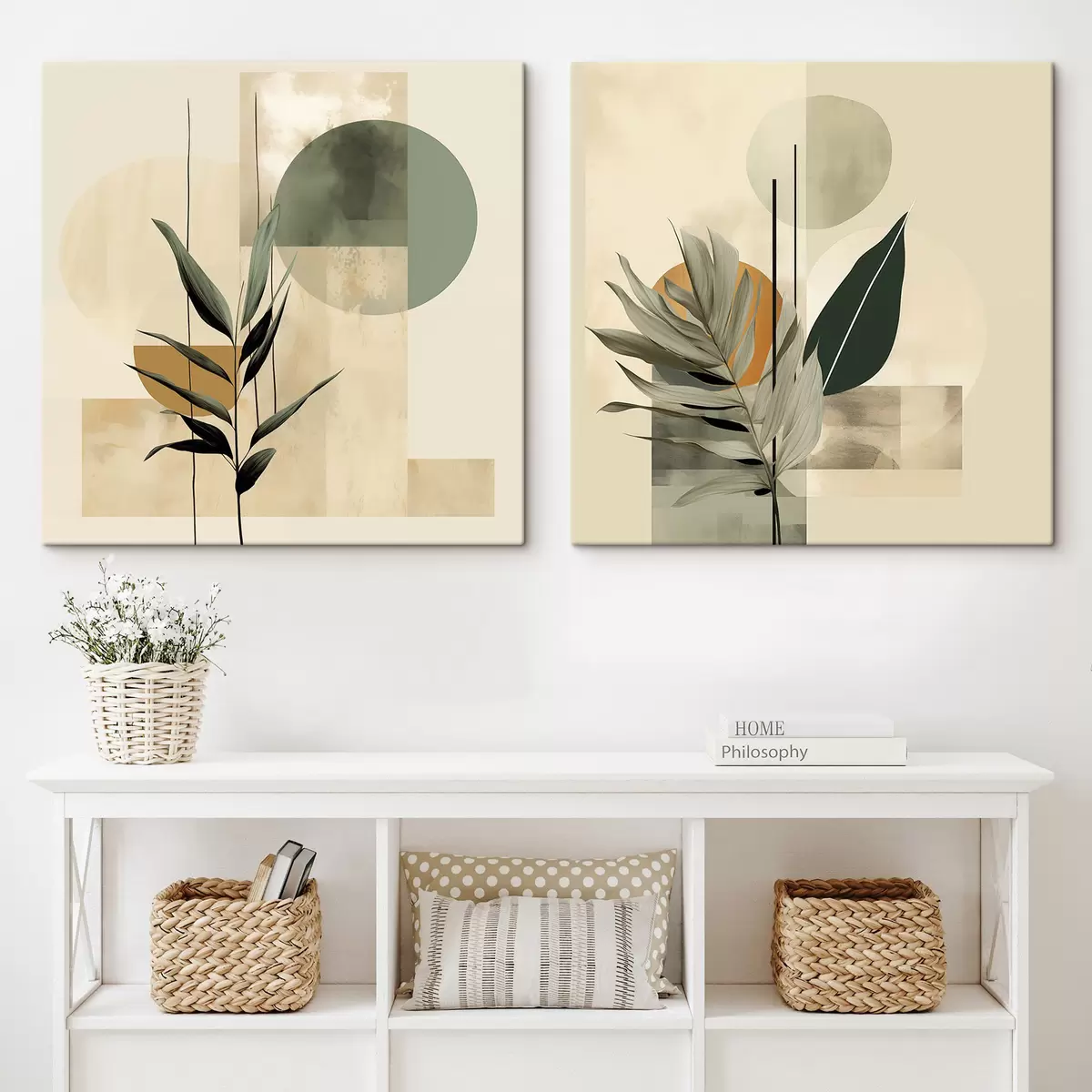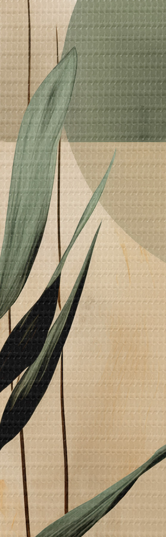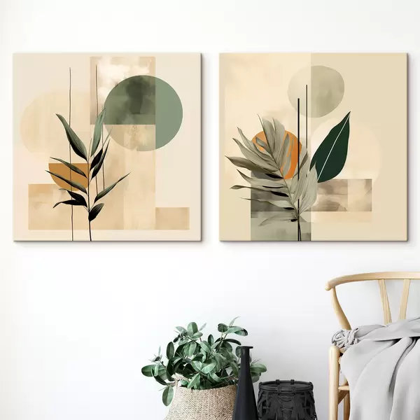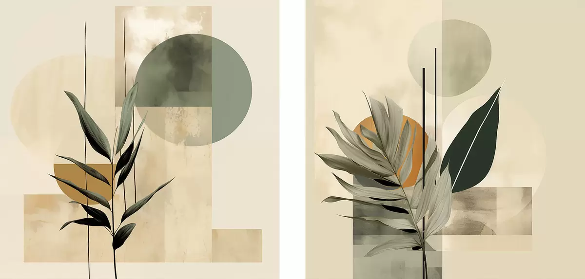 Obraz Ciemnozielona roślina z abstrakcyjnymi geometrycznymi kształtami i akwarelowymi fakturami w odcieniach beżu i zieleni Nr m30209