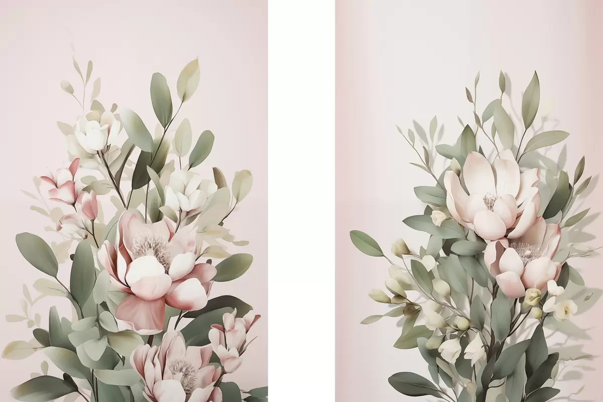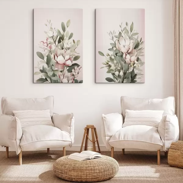 Obraz Bukiet pastelowych kwiatów z liśćmi eukaliptusa na jasnoróżowym tle Nr m30314
