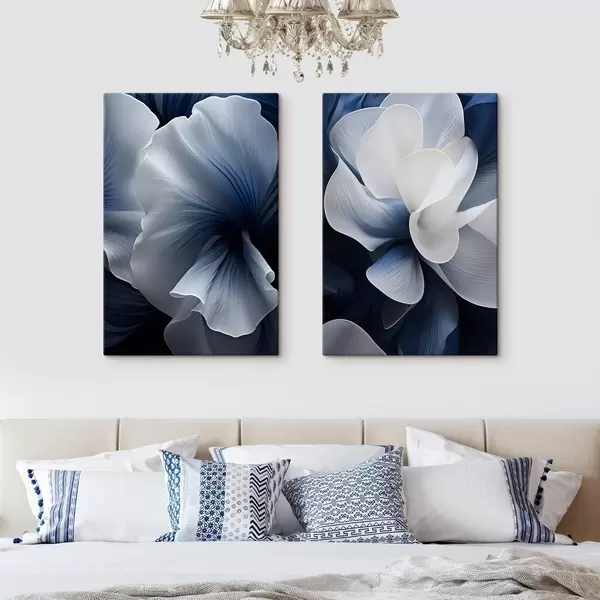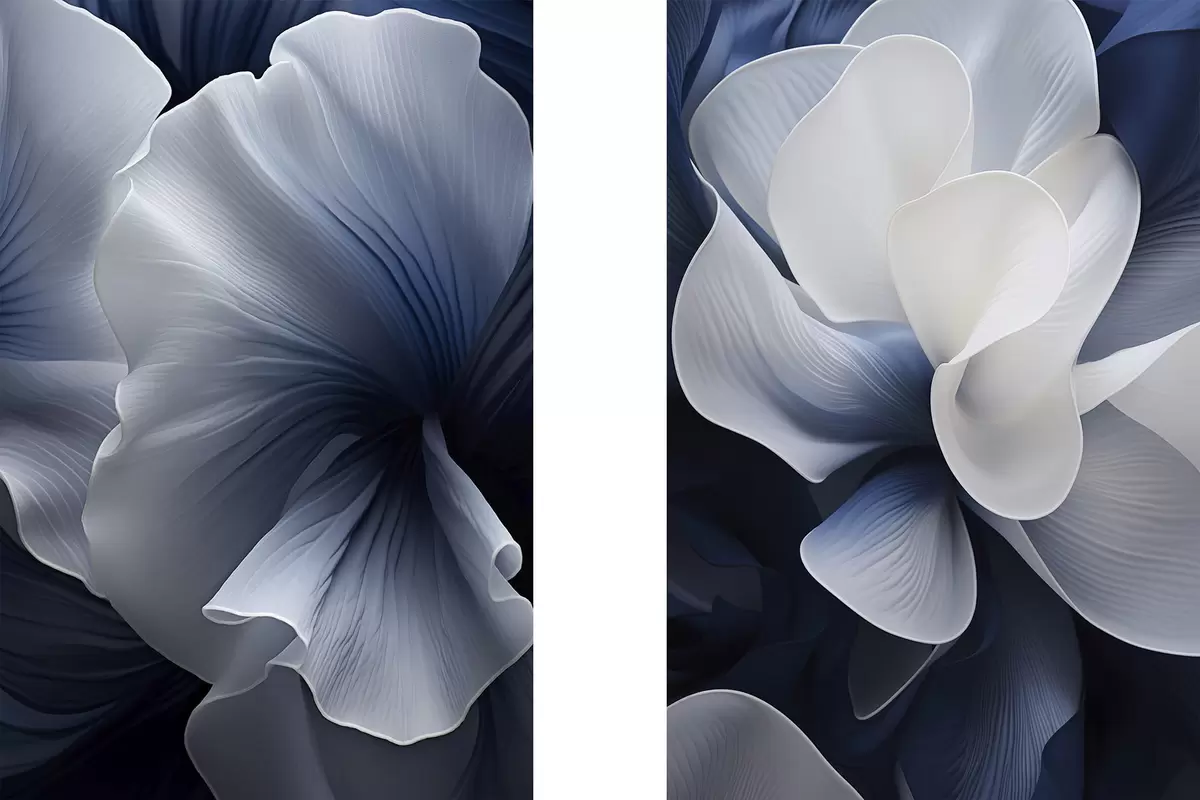 Obraz Abstrakcyjne niebiesko-białe płatki kwiatów na ciemnym tle Nr m30316