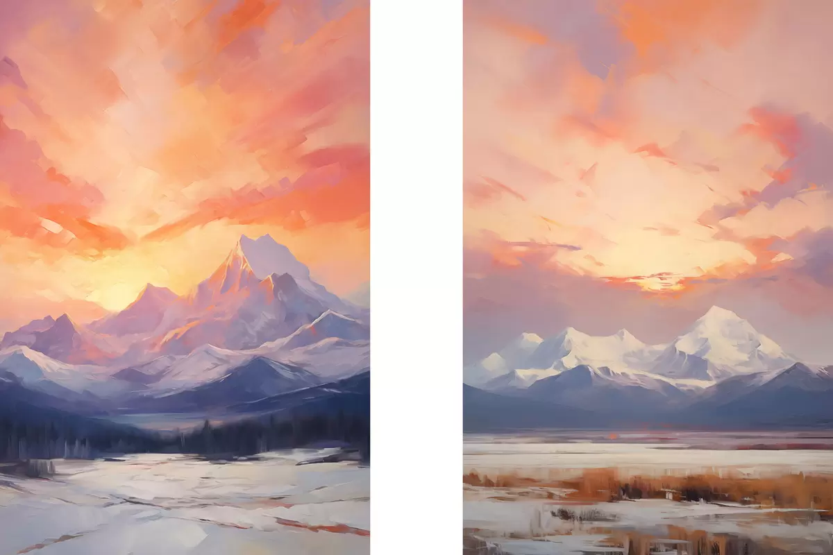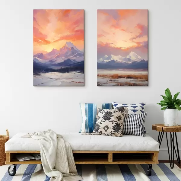 Obraz Ośnieżone szczyty górskie na tle intensywnie pomarańczowo-różowego nieba z chmurami Nr m30321