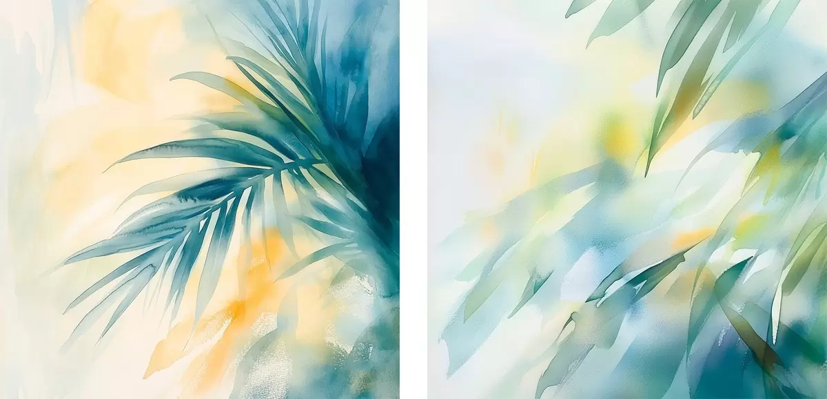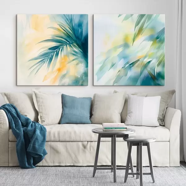 Obraz Tropikalne liście w turkusowo-żółtej kolorystyce w stylu akwareli Nr m30351