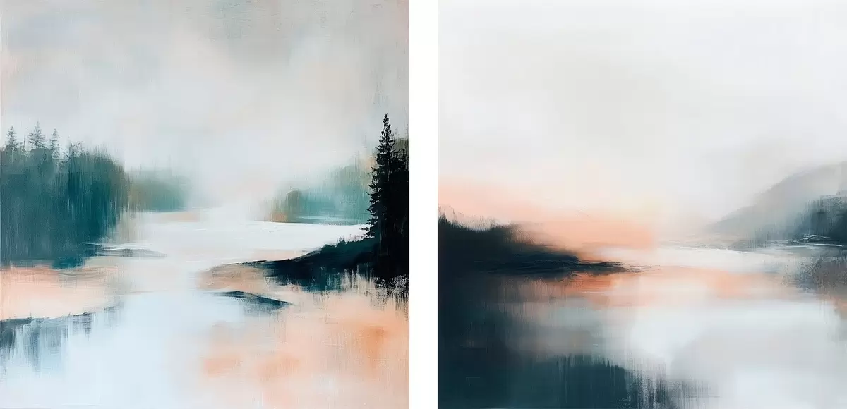 Obraz Mglisty krajobraz z drzewami iglastymi i jeziorem, namalowany w nowoczesnym stylu Nr m30357