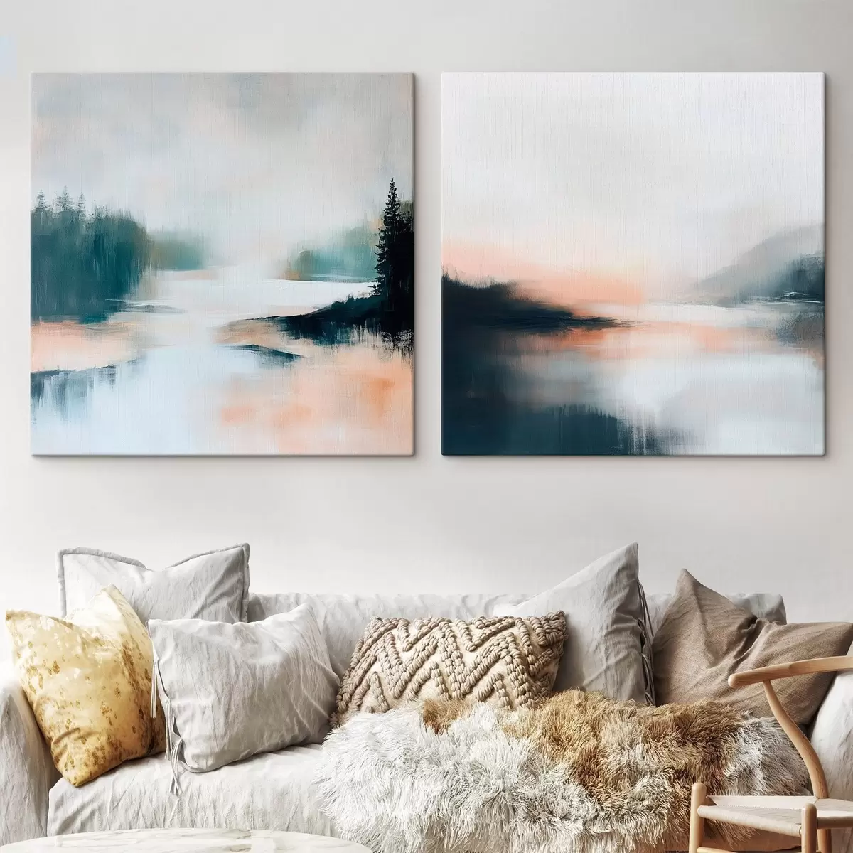 Obraz Mglisty krajobraz z drzewami iglastymi i jeziorem, namalowany w nowoczesnym stylu m30357