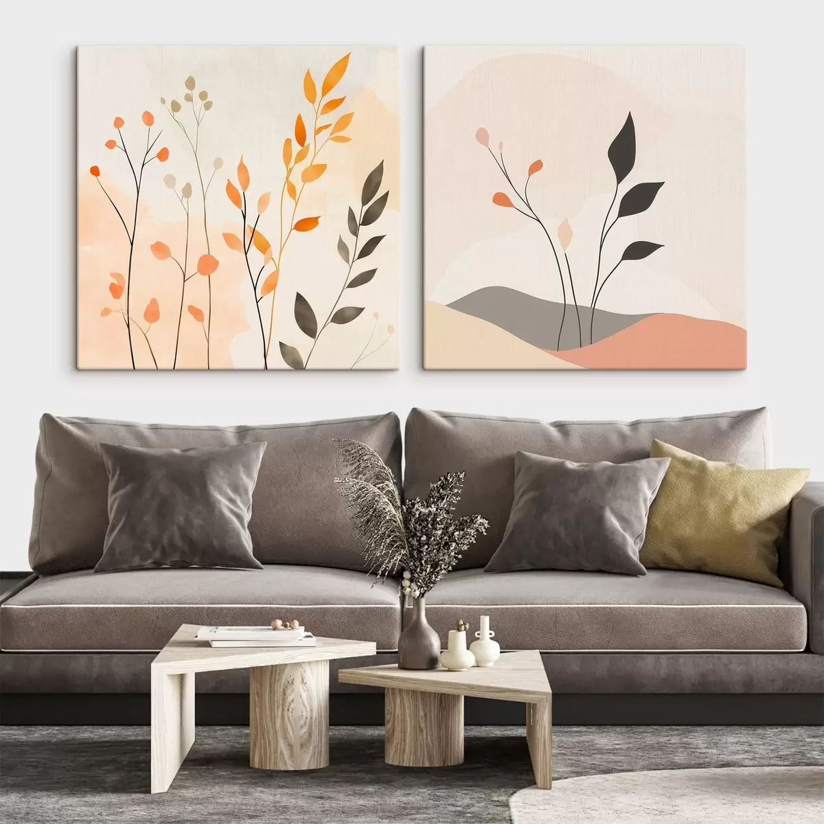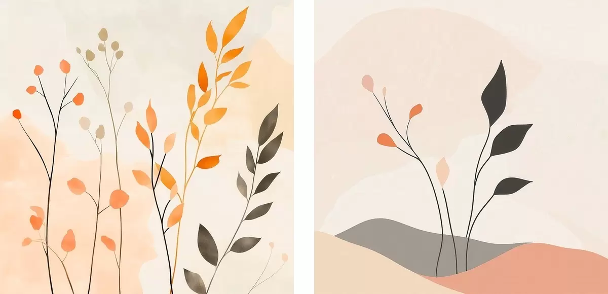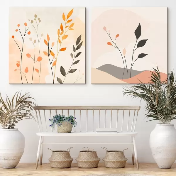 Obraz Kwiatowy dyptyk w ciepłych odcieniach beżu i koralowca z graficznymi liniami w minimalistycznym stylu m30363