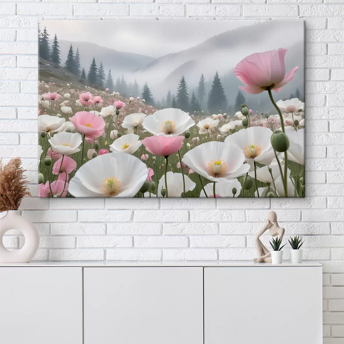 Obraz W tle pole różowych i białych maków w górskim krajobrazie Nr s38369