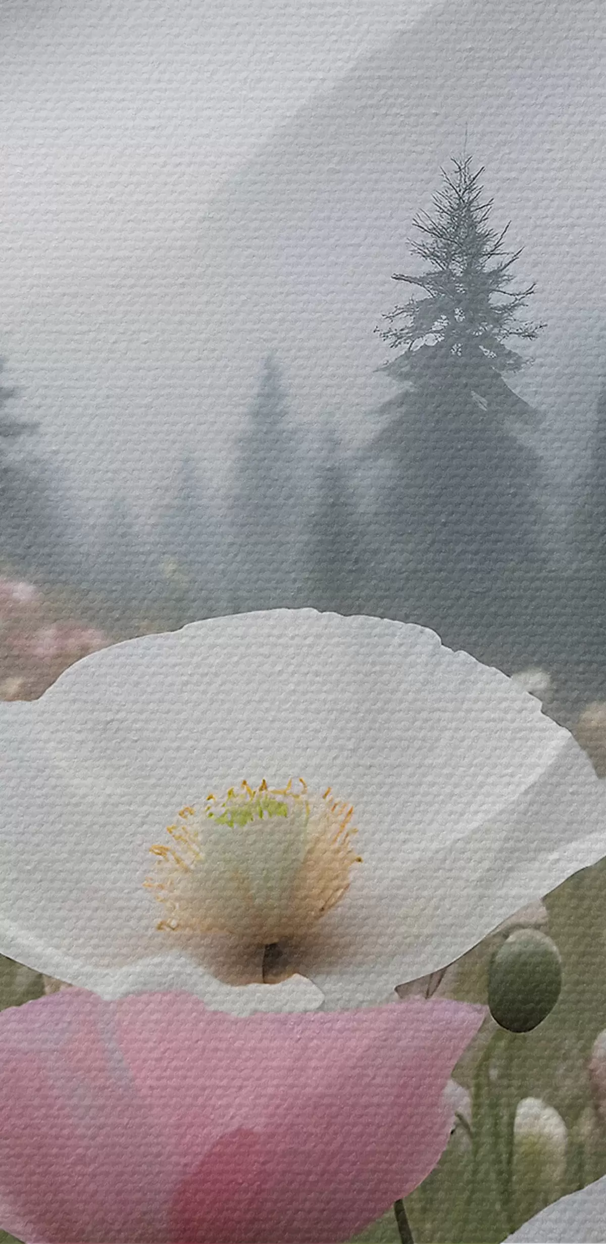 Obraz W tle pole różowych i białych maków w górskim krajobrazie s38369
