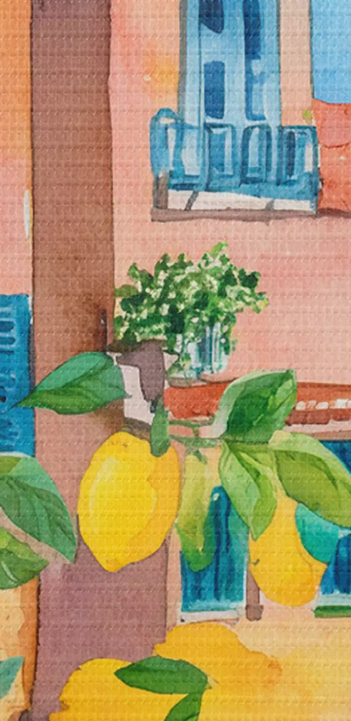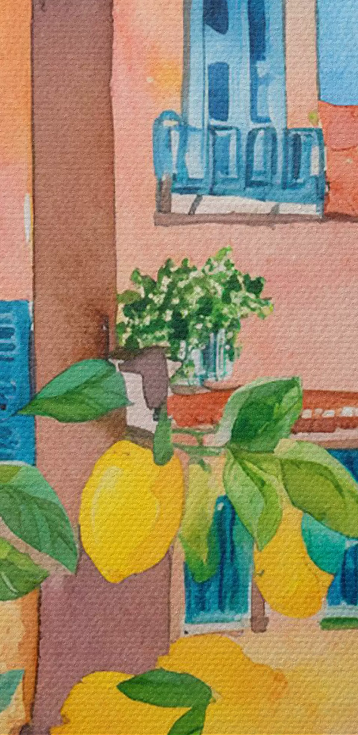 Obraz Włoska architektura miasta, wybrzeże morskie, lato, akwarela, drzewo cytrynowe s38395