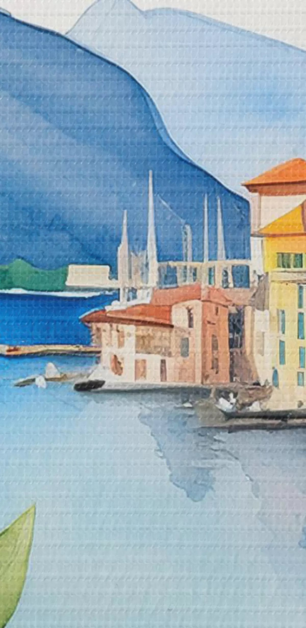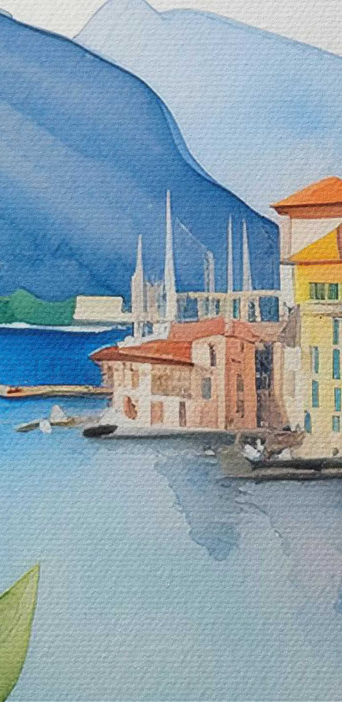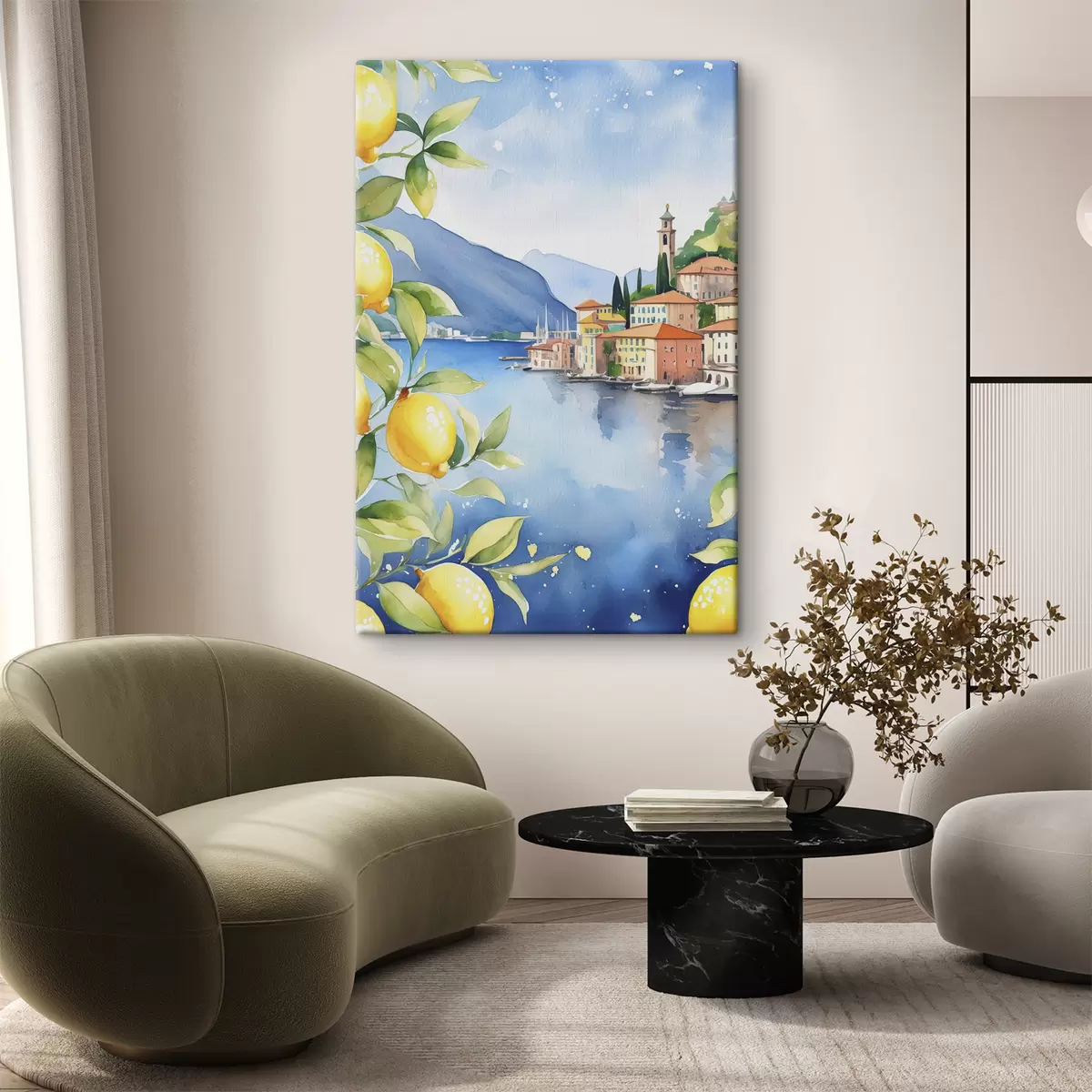 Obraz Włoskie jezioro, lato, akwarela, pejzaż przyrodniczy, cytryny, architektura miasta Nr s38397