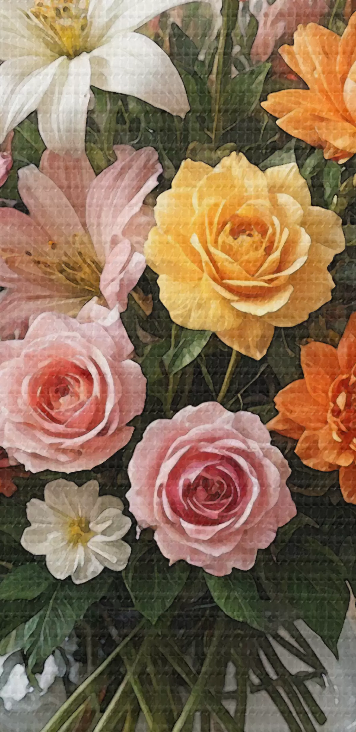 Obraz Żywy bukiet różnych kolorowych kwiatów w szklanym wazonie na białym obrusie w stylu vintage Nr s38825