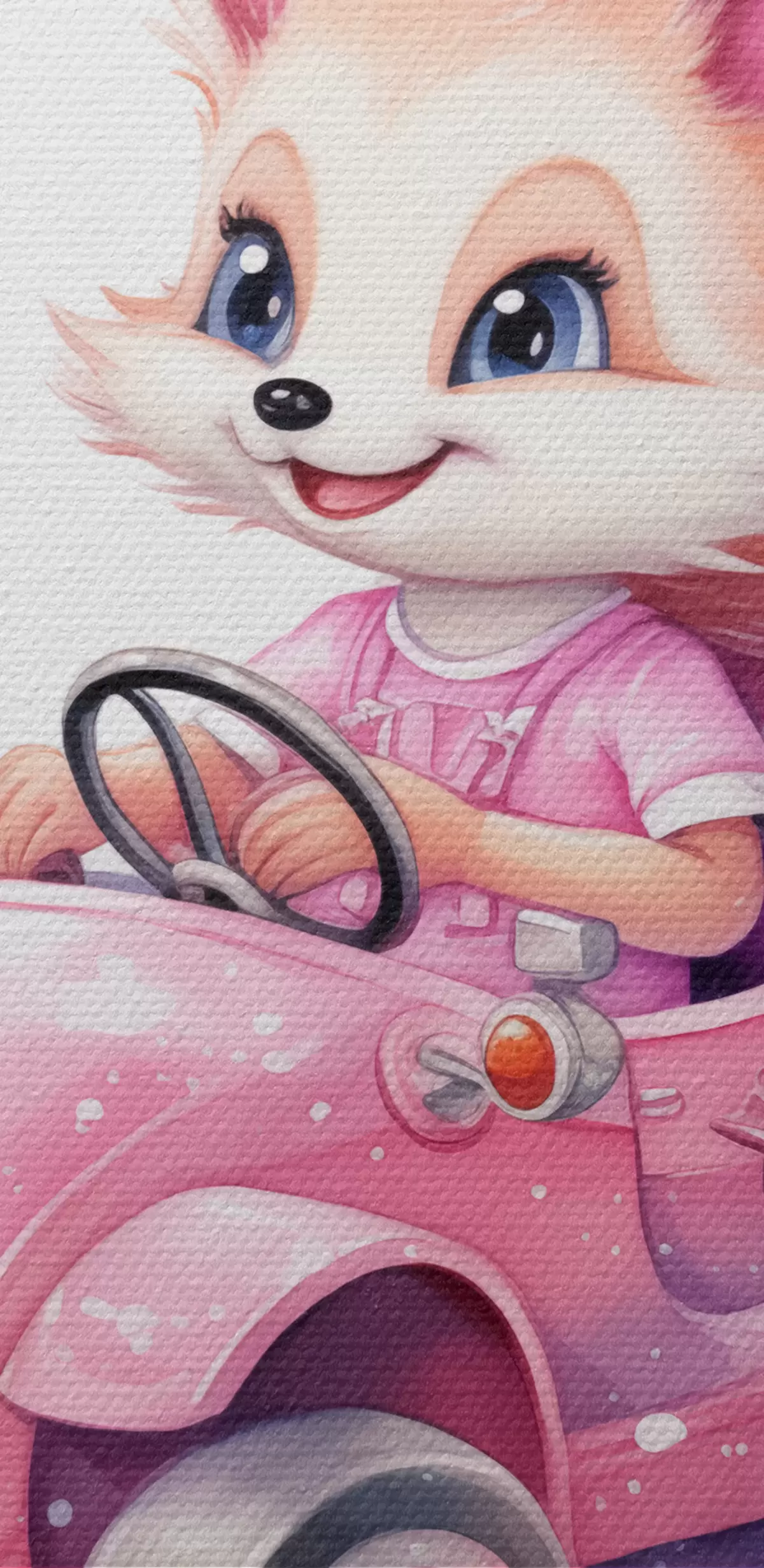 Obraz Mały lis jedzie różowym samochodem. Akwarela ilustracja dla dzieci Nr s38943