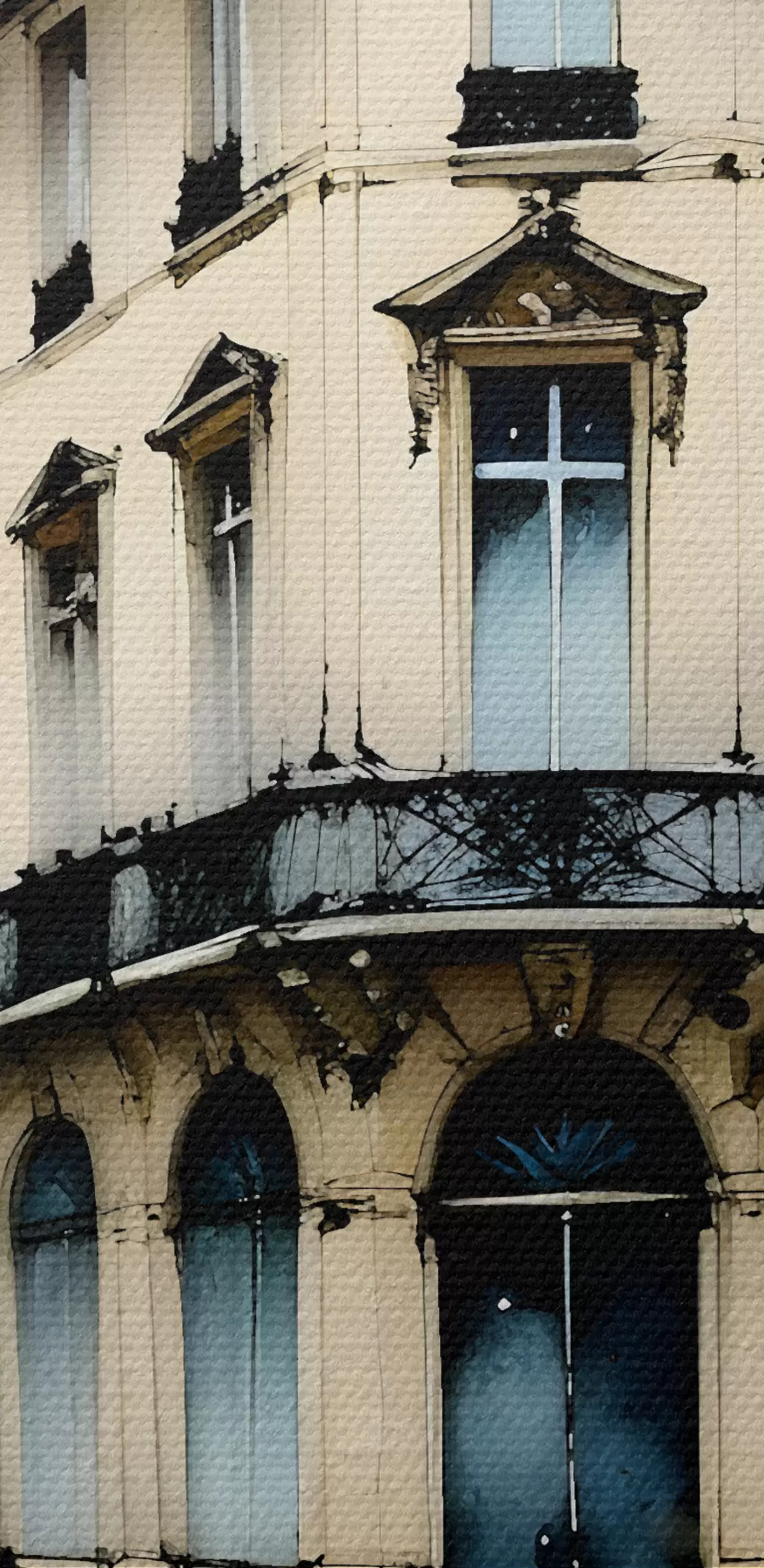 Obraz Akwarela przedstawiająca zabytkowy budynek z zakrzywioną fasadą i dekoracyjnymi elementami architektonicznymi Nr s38975