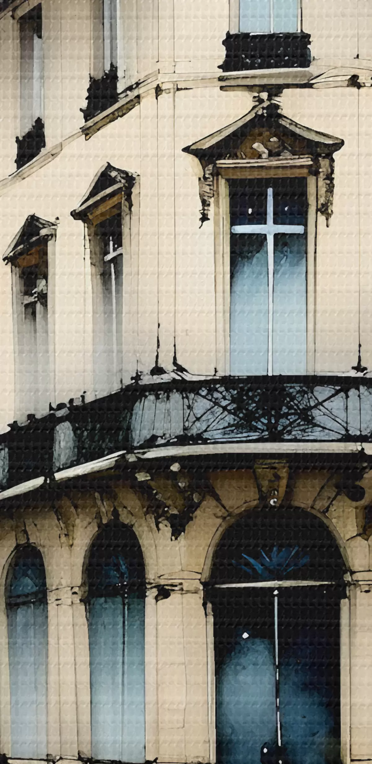 Obraz Akwarela przedstawiająca zabytkowy budynek z zakrzywioną fasadą i dekoracyjnymi elementami architektonicznymi s38975
