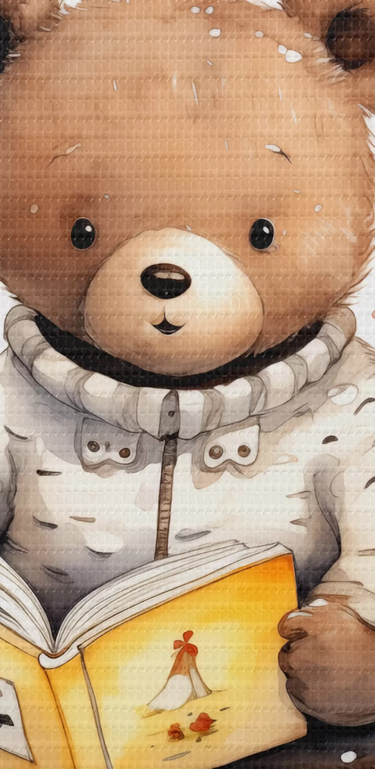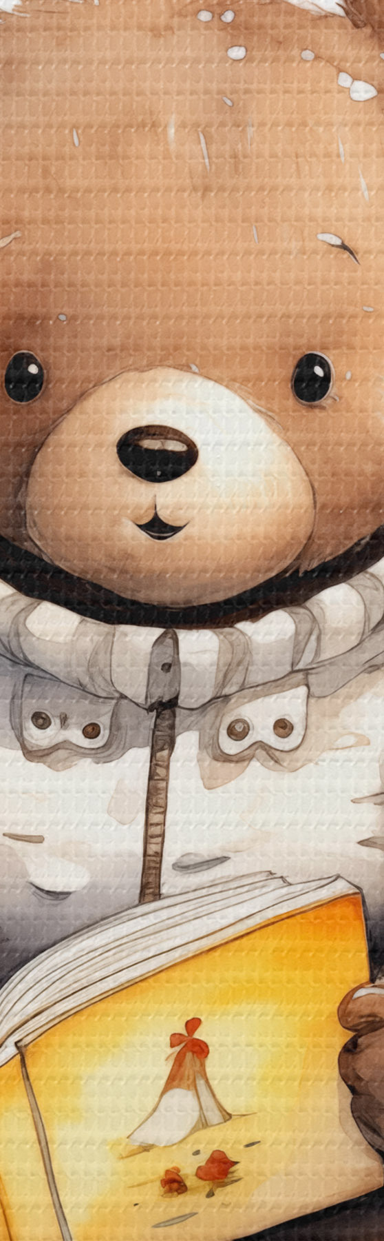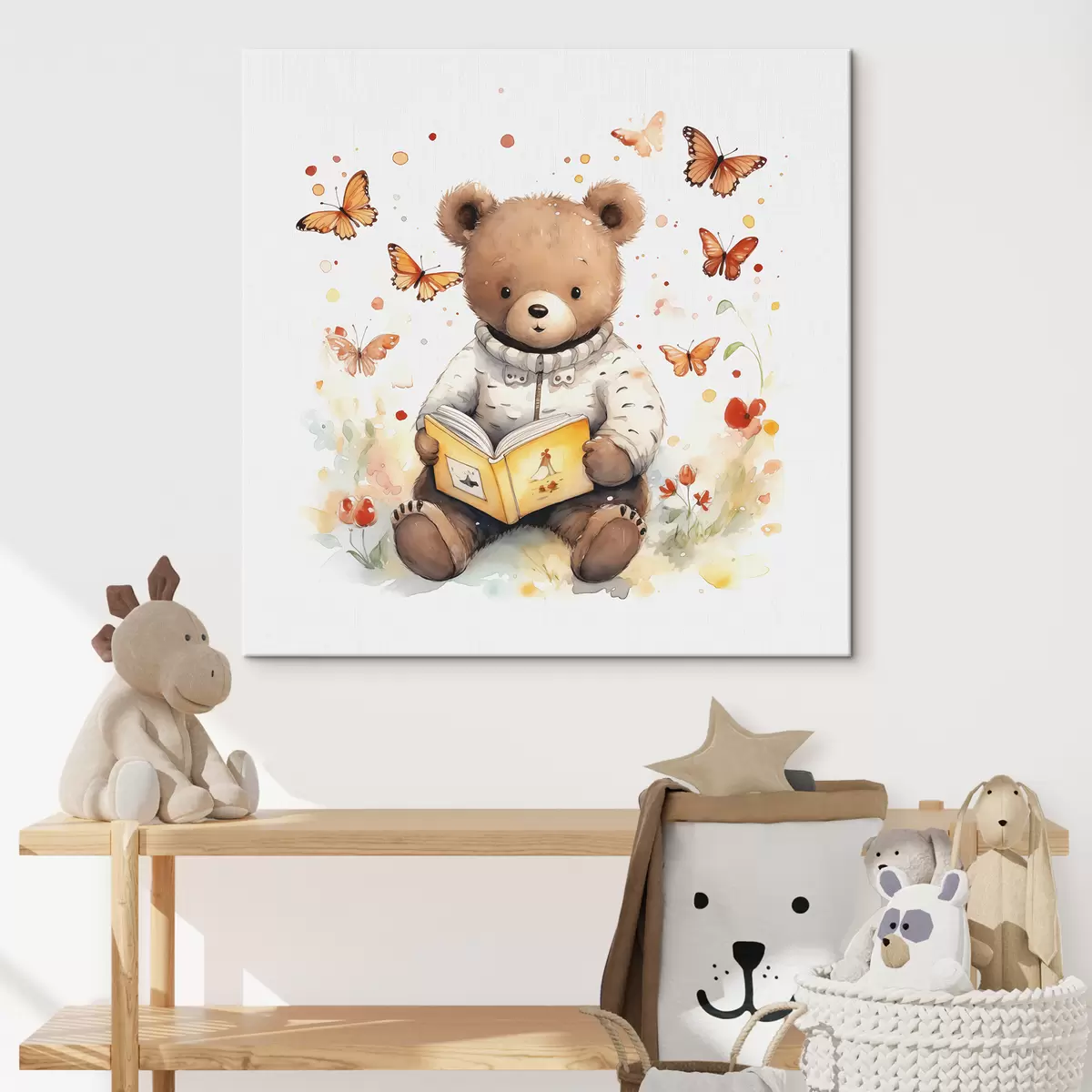 Obraz Niedźwiedź brunatny w swetrze czyta książkę otoczoną akwarelowymi motylami Nr s39025