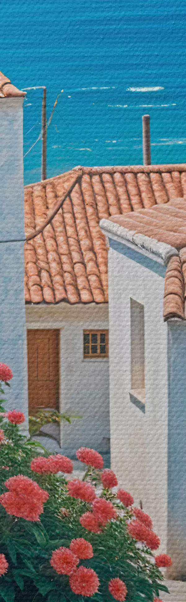 Obraz Wąska ulica w nadmorskim miasteczku z białymi budynkami, dachami z czerwonych dachówek i żywymi różowymi kwiatami Nr s39532