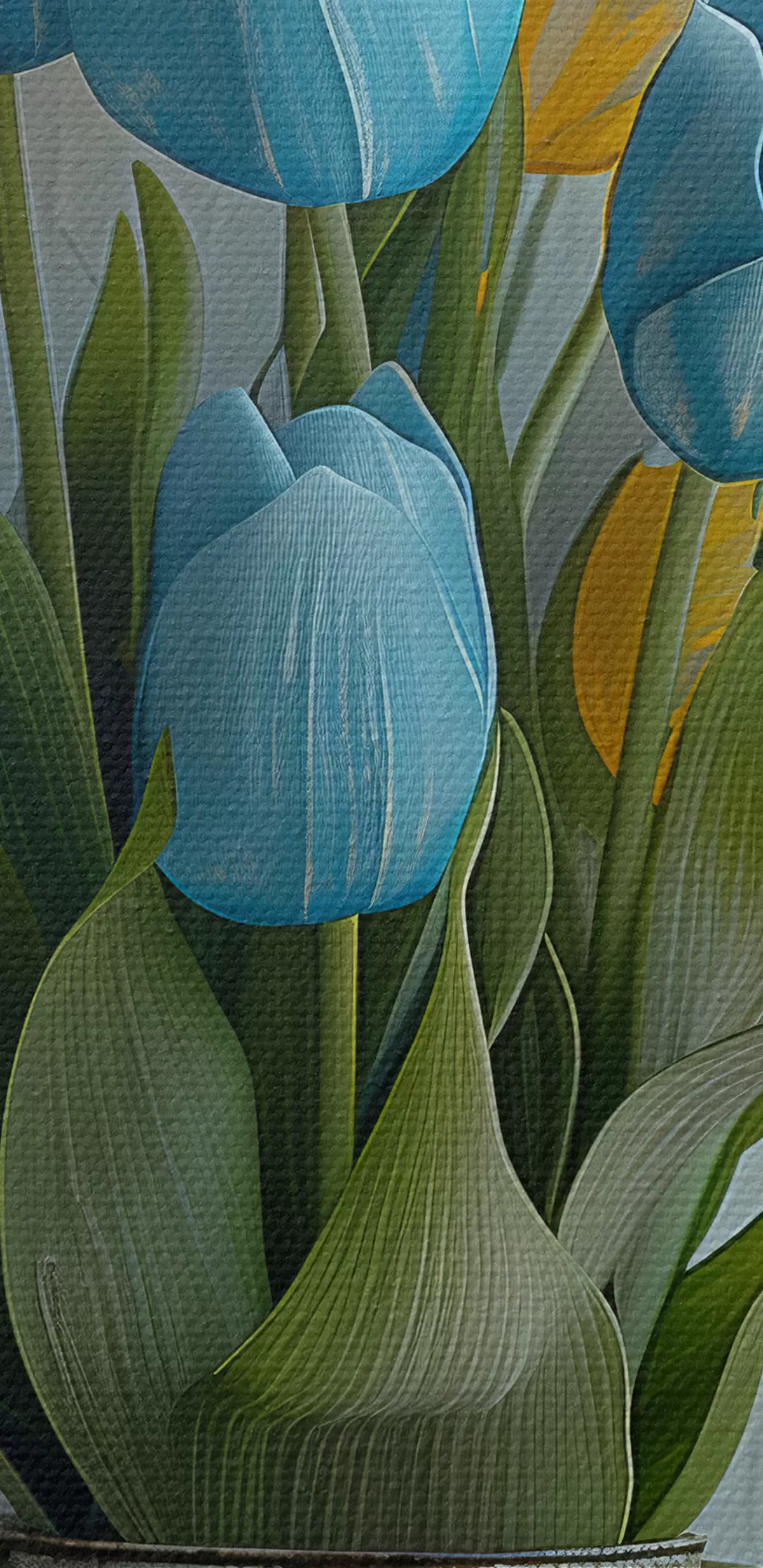 Obraz Niebieskie i żółte tulipany w 3D: elegancki obraz ścienny z białą ramką, białym i jasnoniebieskim tłem oraz grawerowanym wazonem s39636