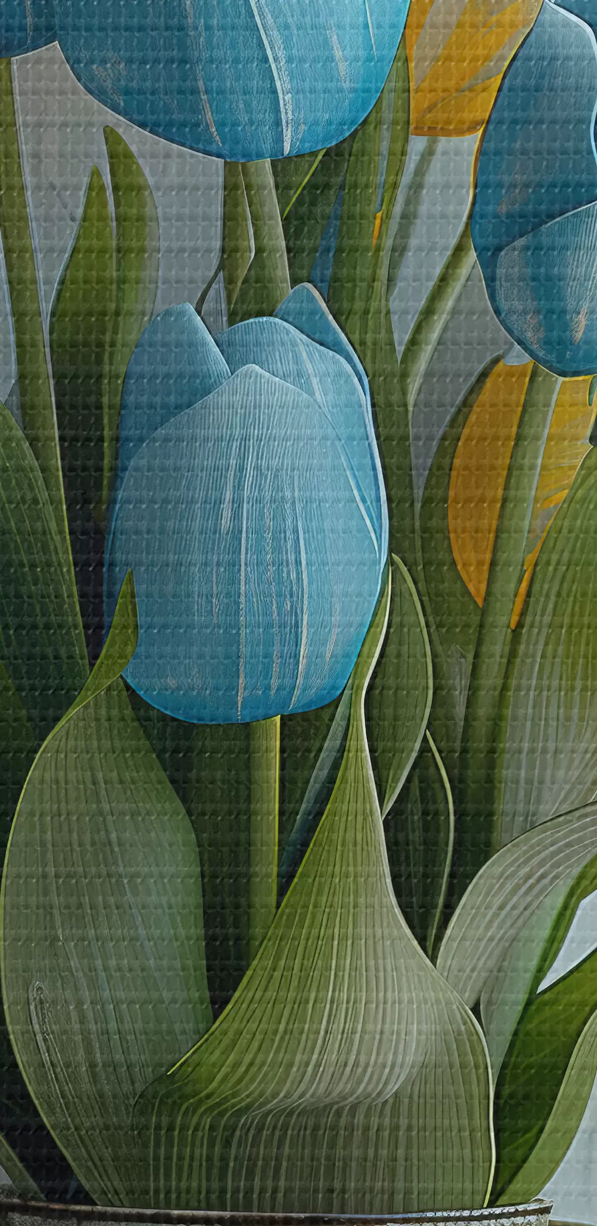 Obraz Niebieskie i żółte tulipany w 3D: elegancki obraz ścienny z białą ramką, białym i jasnoniebieskim tłem oraz grawerowanym wazonem Nr s39636