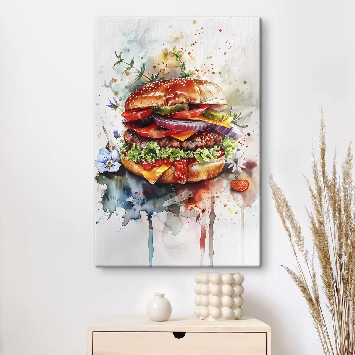 Obraz Smaczny burger z mięsem, kwiatami, akwarelą, sztuką kulinarną Nr s39699