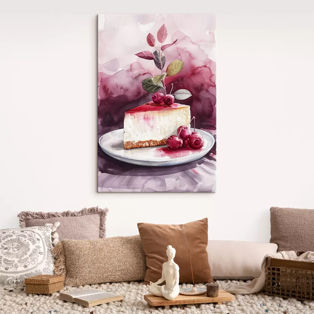 Obraz Akwarelowy sernik z wiśniami, elegancka sztuka kulinarna, kolory czerwony i fioletowy s39700