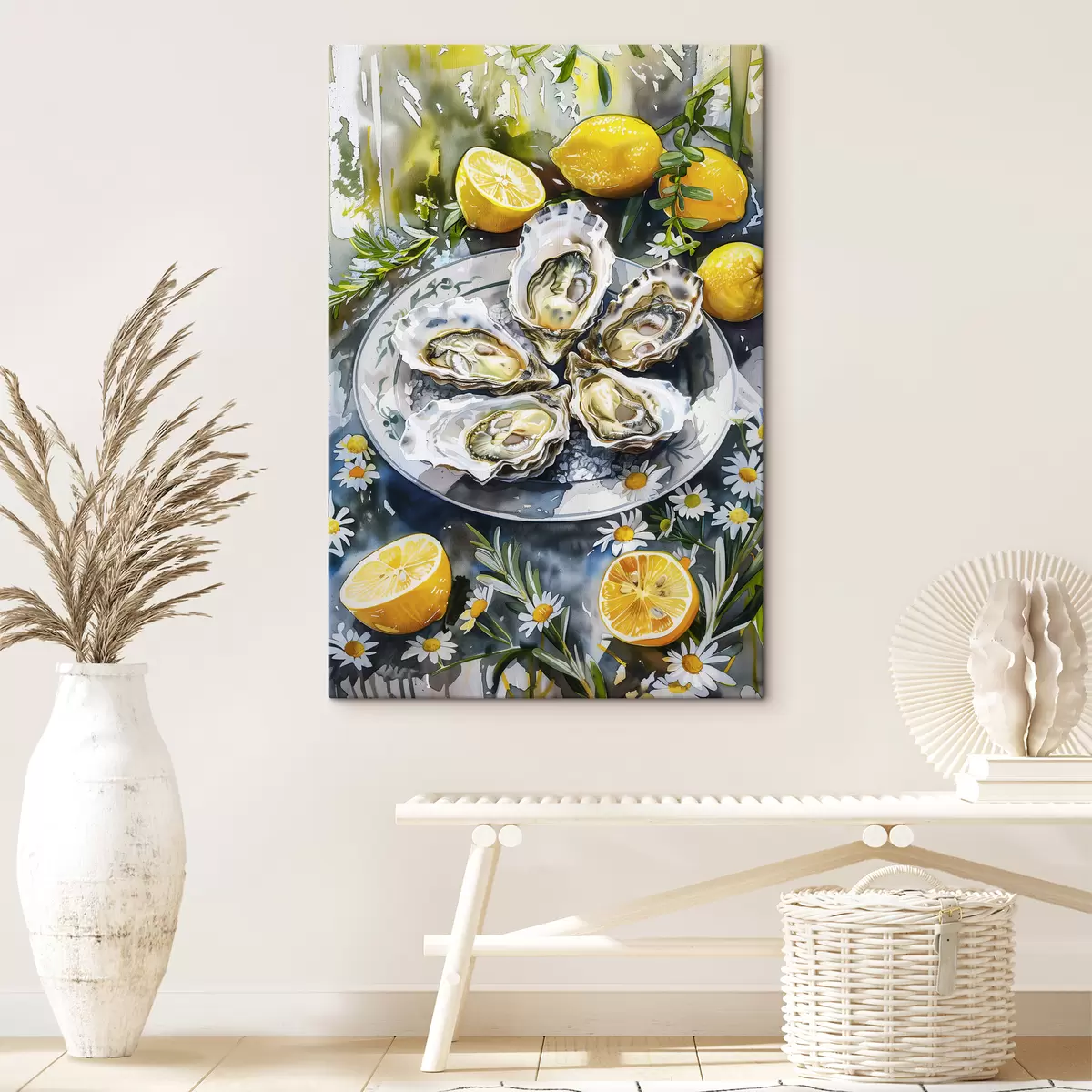 Obraz Eleganckie ostrygi na talerzu, cytryny i kwiaty, letnie kolory, śródziemnomorskie Nr s39710
