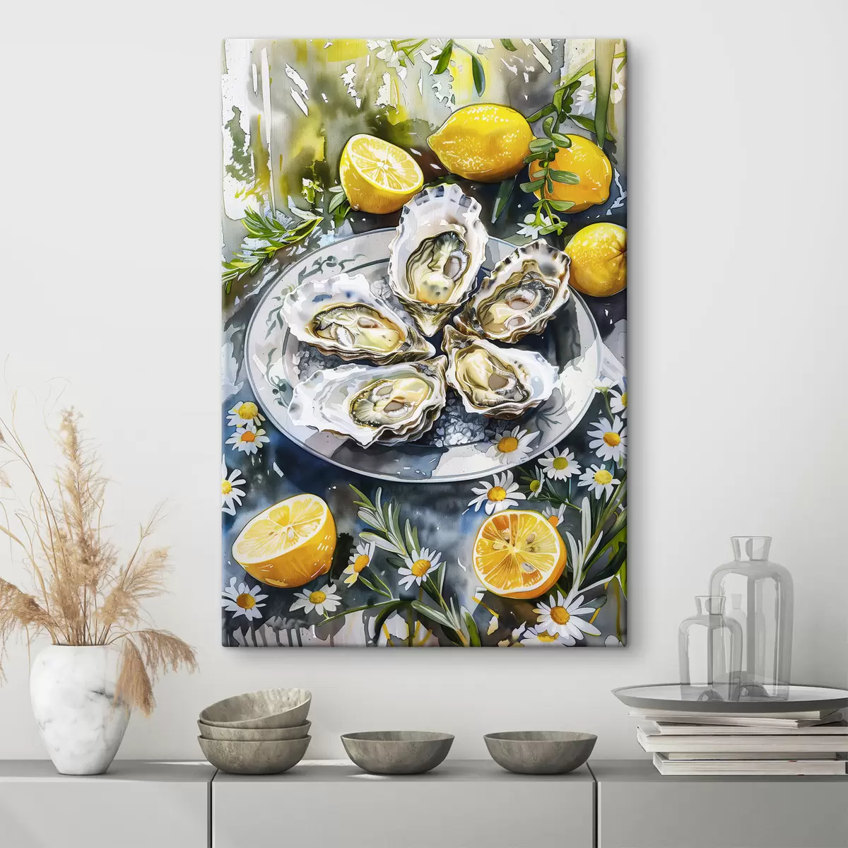 Obraz Eleganckie ostrygi na talerzu, cytryny i kwiaty, letnie kolory, śródziemnomorskie s39710