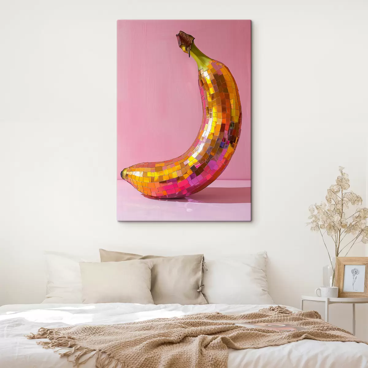 Obraz Malowana olejem banayowa kula dyskotekowa z jasnopastelowym różowym tłem Nr s39766