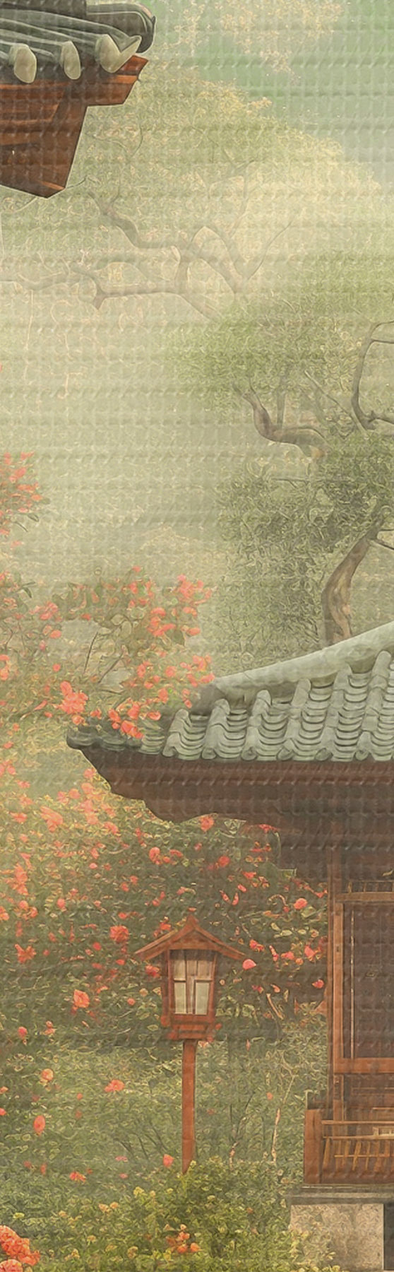 Obraz Japoński park z kwitnącymi drzewami i kwiatami, las, drewniany dom Nr s39773