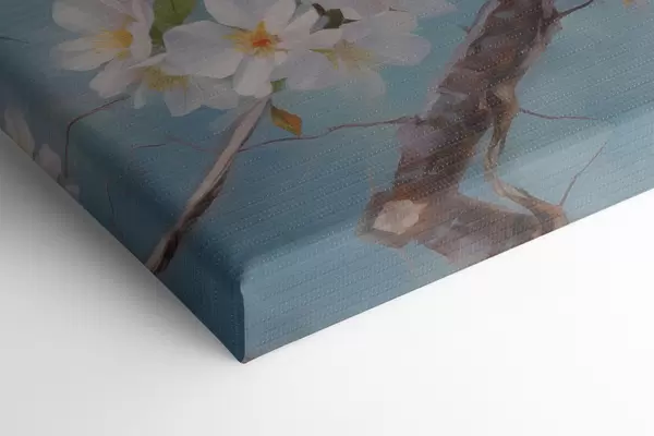 Obraz Wróble siedzące na kwitnącej gałęzi Obraz olejny, niebieski, biały, brązowy Nr s39829