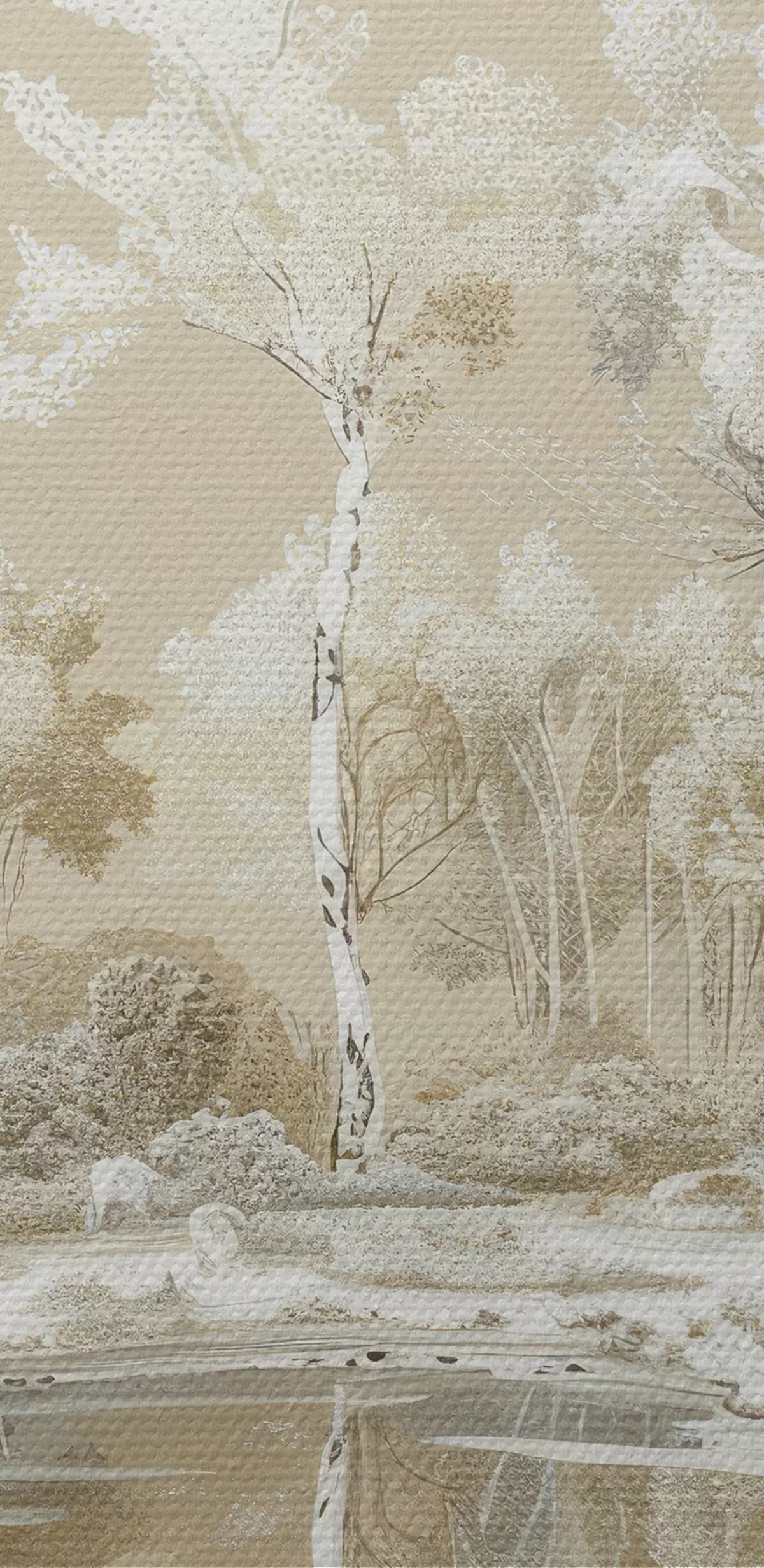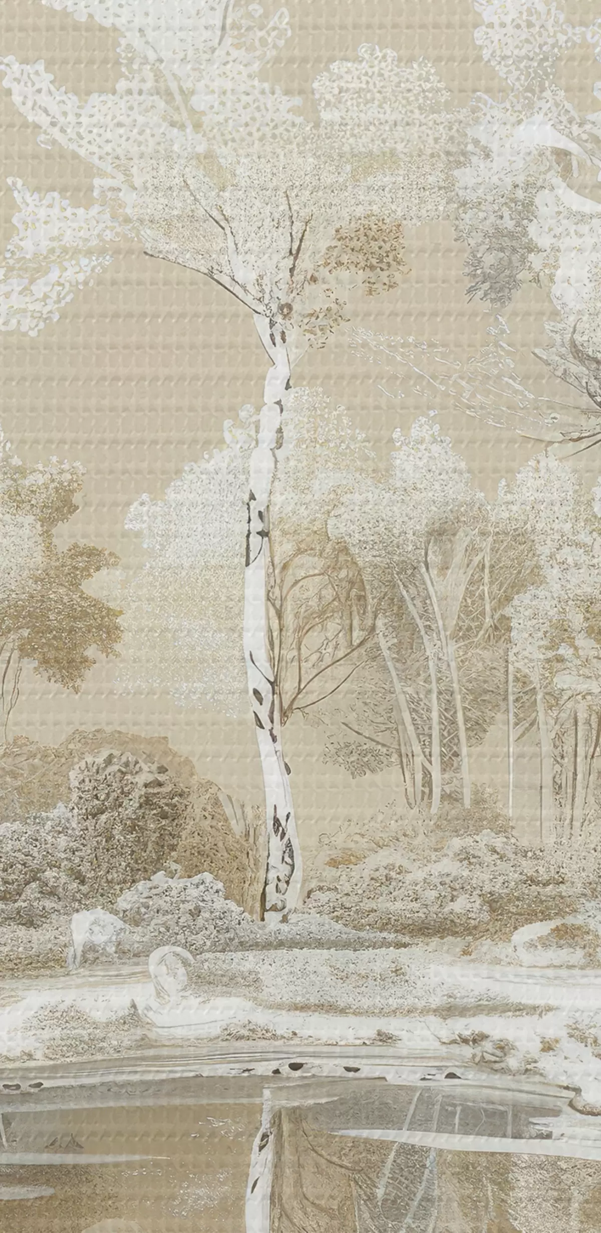 Obraz Piękny krajobraz leśny, staw i drzewa, kolory beżowy i biały s39979