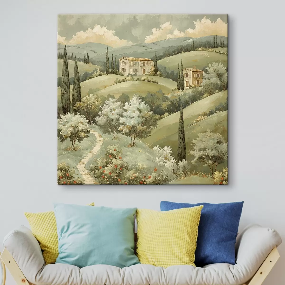 Obraz Krajobraz ze starymi domami, pastelowe zielone kolory, rysunek akrylowy, lato s40078