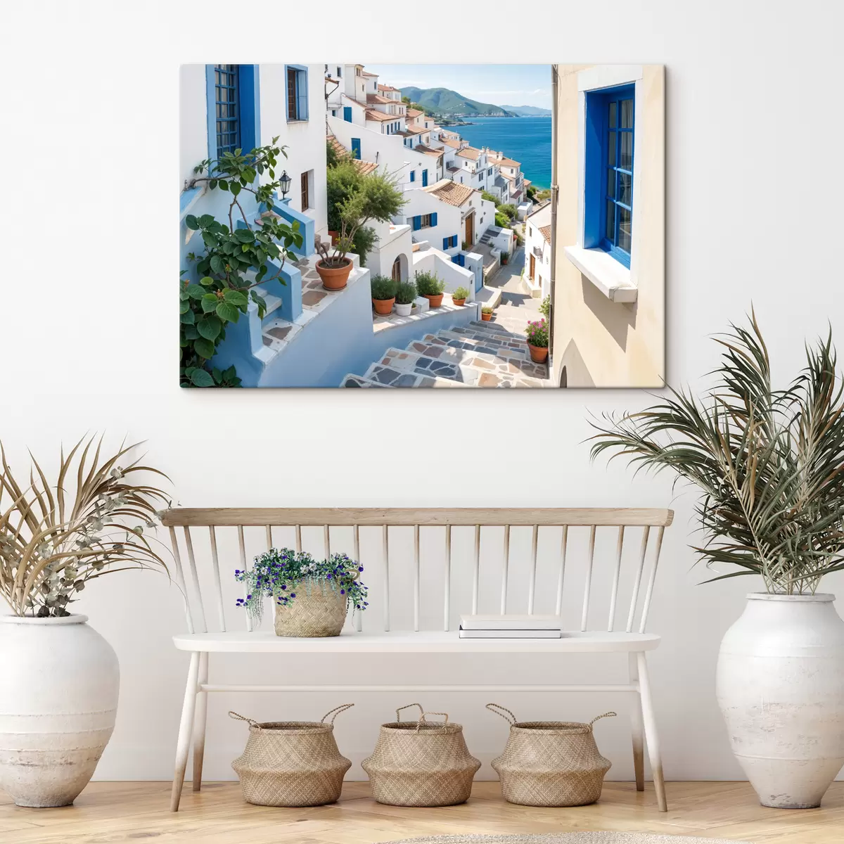 Obraz Malownicze nadmorskie miasteczko z białymi budynkami, niebieskimi oknami i doniczkowymi roślinami rosnącymi wzdłuż wąskich uliczek  s40148