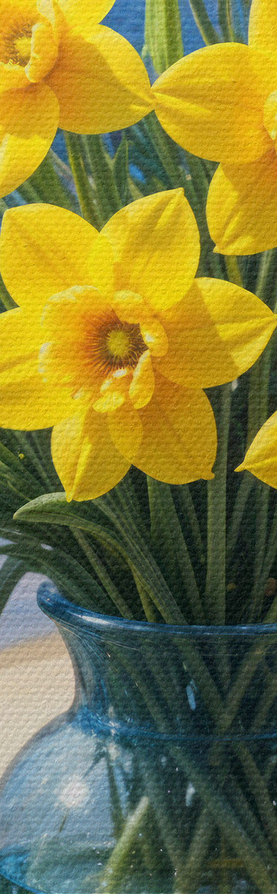 Obraz Bukiet żółtych żonkili i białych stokrotek w szklanym wazonie na parapecie z widokiem na plażę i ocean Nr s40171